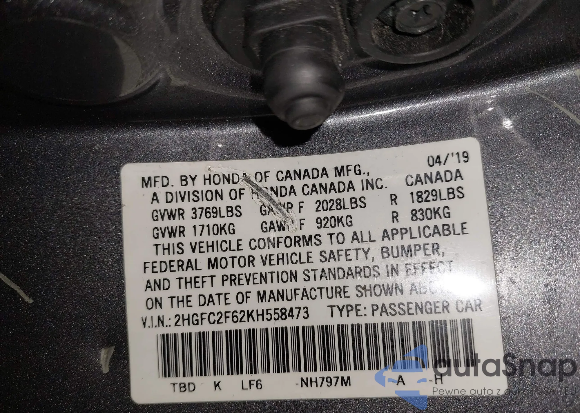 • VIN: 2HGFC2F62KH558473