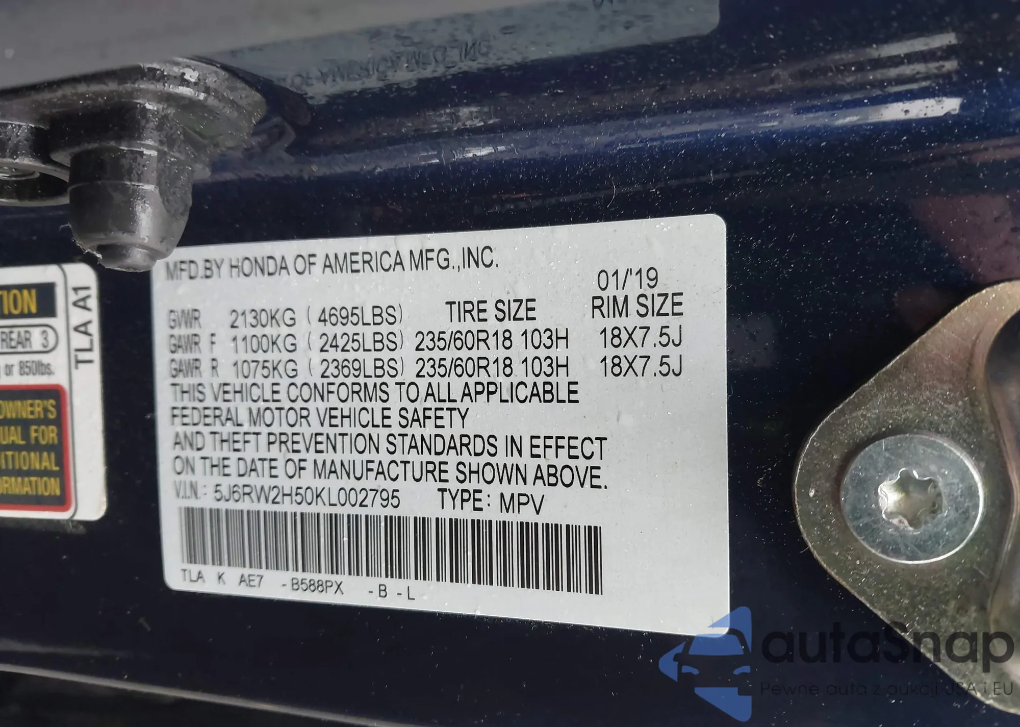 VIN: 5J6RW2H50KL002795