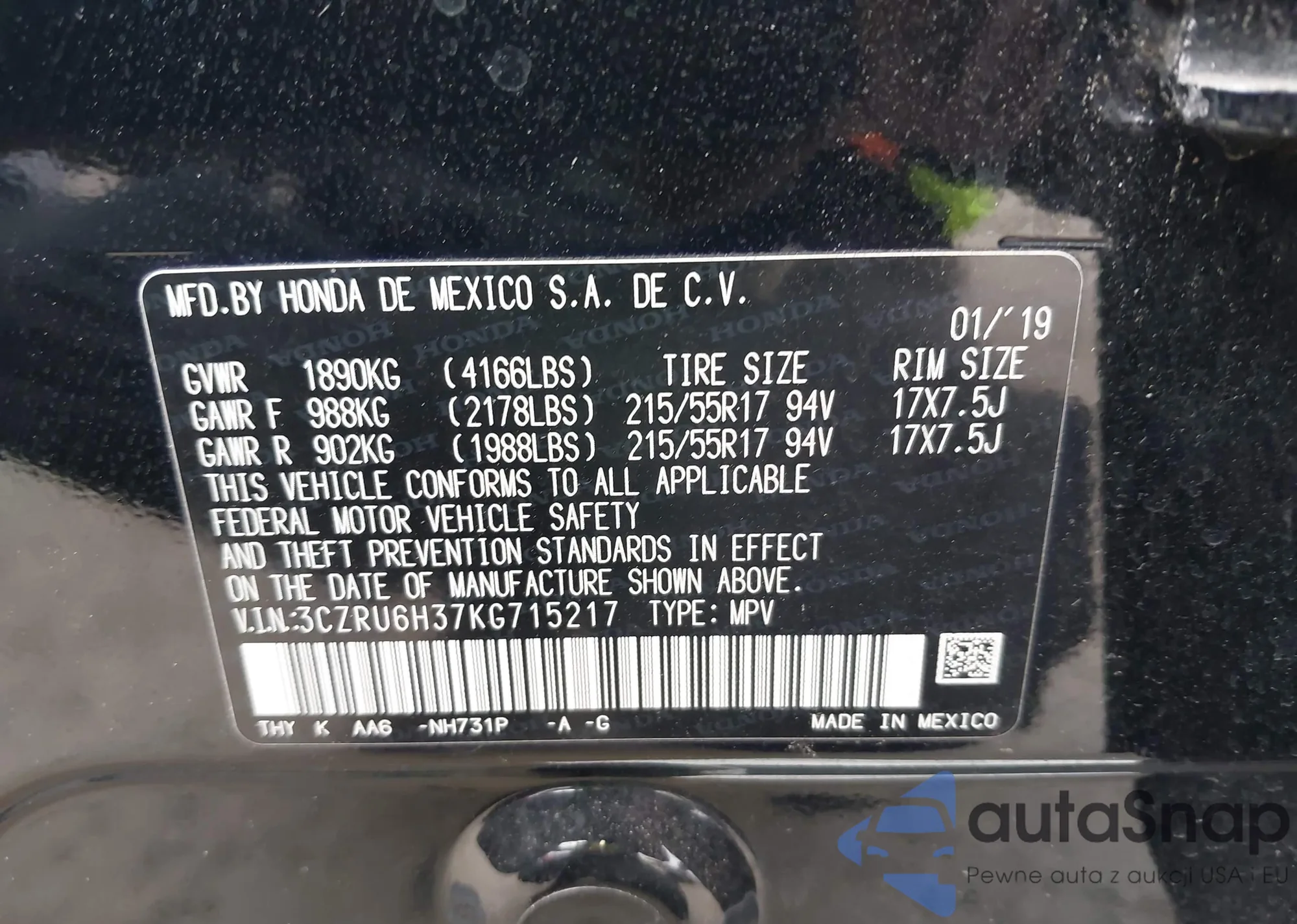 Samochód Honda HR-V 2019 (VIN 3CZRU6H37KG715217) nie był wcześniej licytowany. Dokumenty są czyste, przebieg odpowiada lub jest niższy niż średnia rynku. Sprzedaje go firma ubezpieczeniowa – polecamy zakup. Dostawa do portu zajmie ok. 6–8 tygodni.