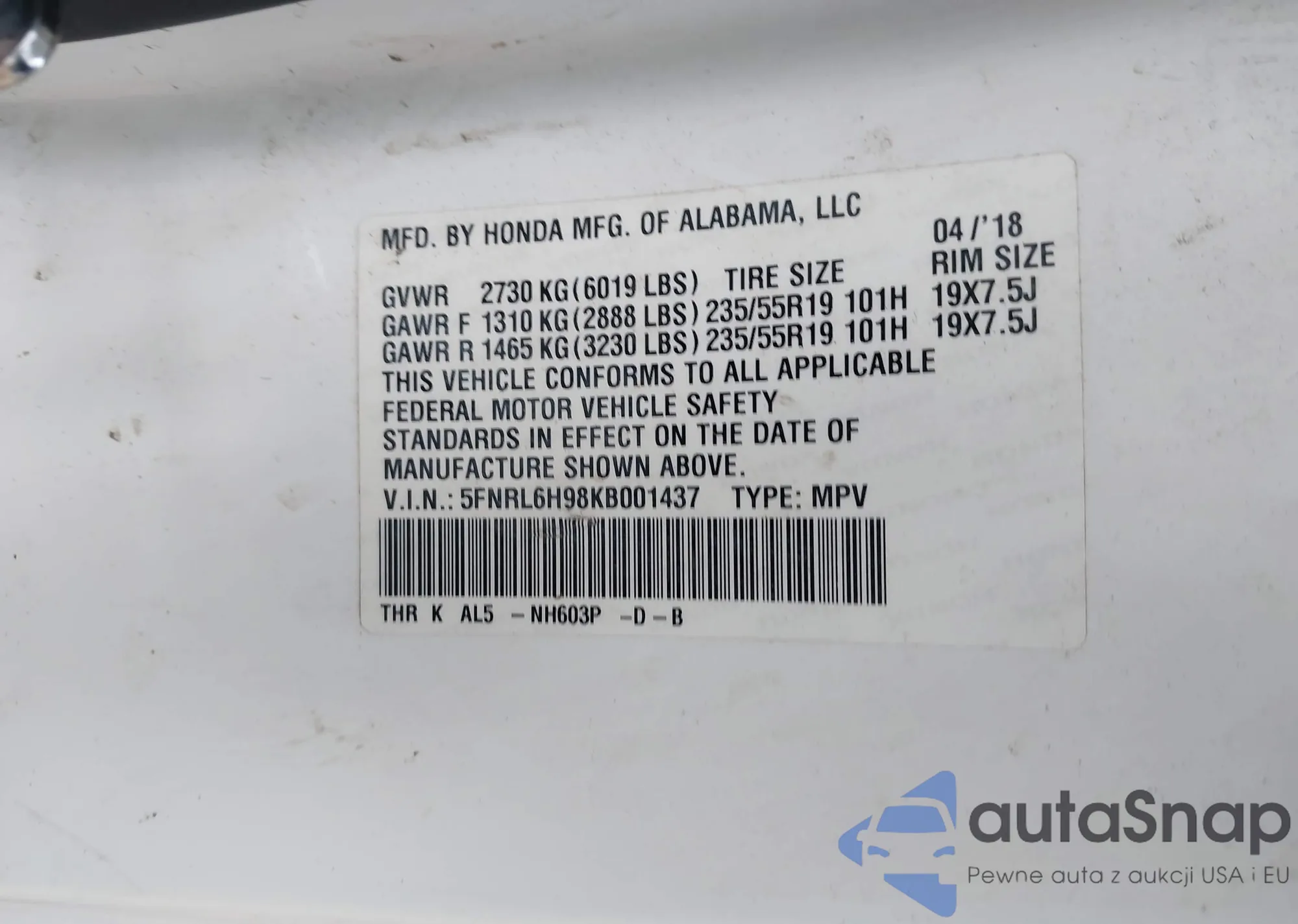 Samochód Honda Odyssey 2019 (VIN 5FNRL6H98KB001437) nie był wcześniej licytowany. Dokumenty są czyste, przebieg odpowiada lub jest niższy niż średnia rynku. Sprzedaje go firma ubezpieczeniowa – polecamy zakup. Dostawa do portu zajmie ok. 6–8 tygodni.