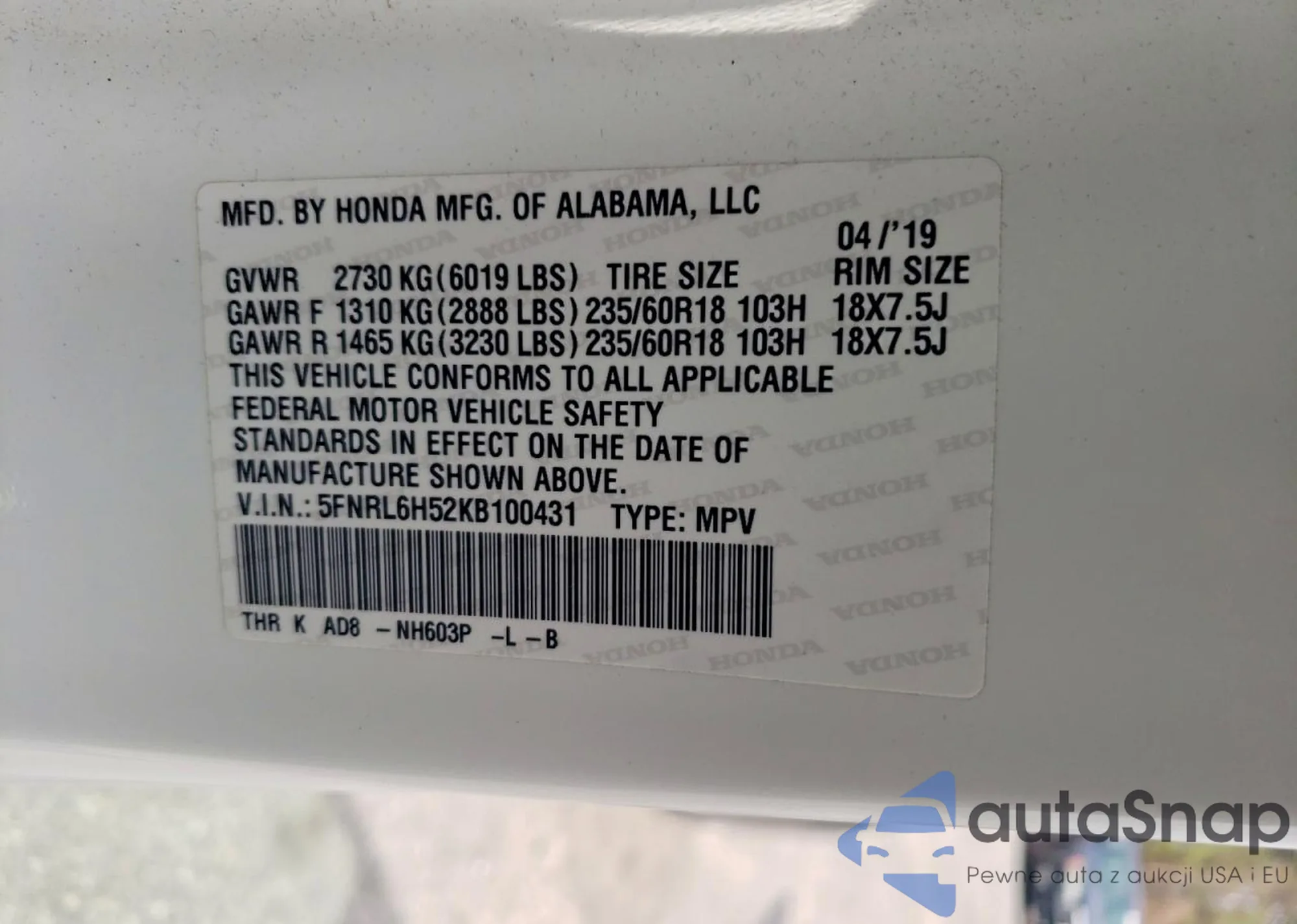 Samochód Honda Odyssey 2019 (VIN 5FNRL6H52KB100431) sprzedaje go niezweryfikowany sprzedawca. Zalecamy raport Carfax i potwierdzenie możliwości rejestracji pojazdu przed zakupem.