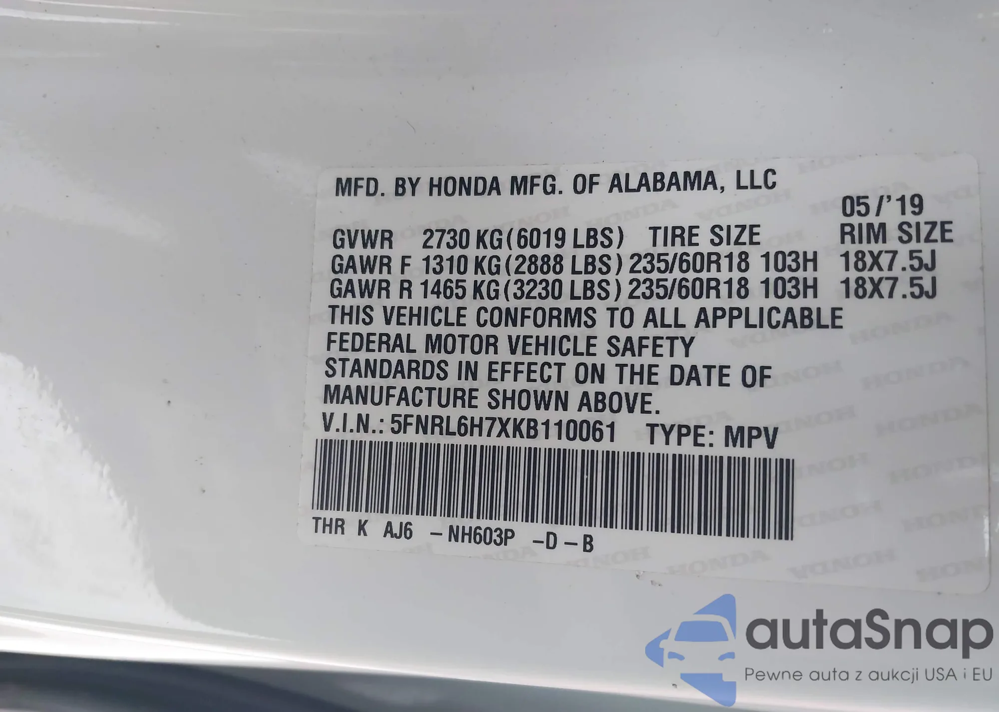 Samochód Honda Odyssey 2019 (VIN 5FNRL6H7XKB110061) nie był wcześniej licytowany. Dokumenty są czyste, przebieg odpowiada lub jest niższy niż średnia rynku. Sprzedaje go firma ubezpieczeniowa – polecamy zakup. Dostawa do portu zajmie ok. 6–8 tygodni.