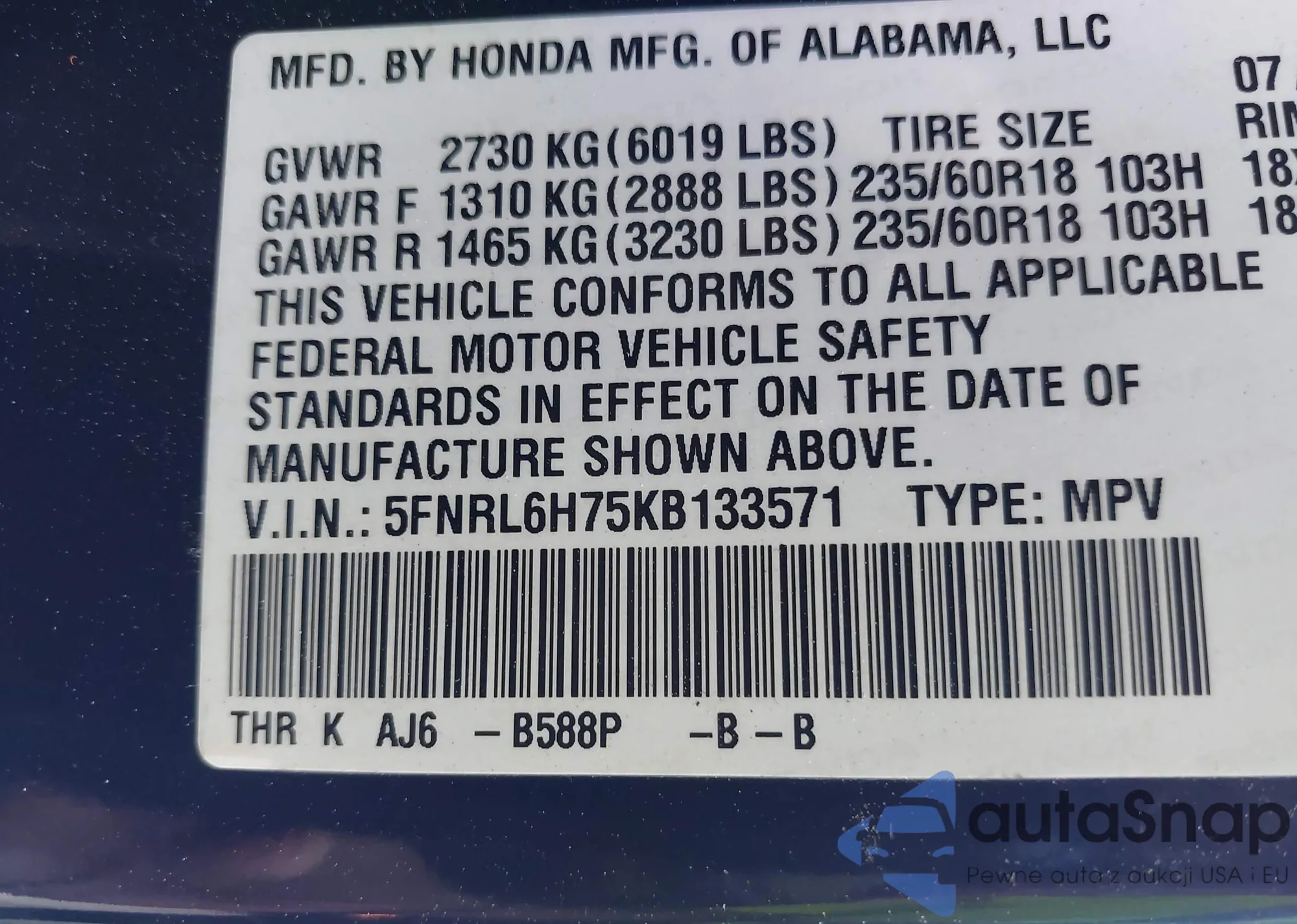 Samochód Honda Odyssey 2019 (VIN 5FNRL6H75KB133571) nie był wcześniej licytowany. Dokumenty są czyste, przebieg odpowiada lub jest niższy niż średnia rynku. Sprzedaje go firma ubezpieczeniowa – polecamy zakup. Dostawa do portu zajmie ok. 6–8 tygodni.