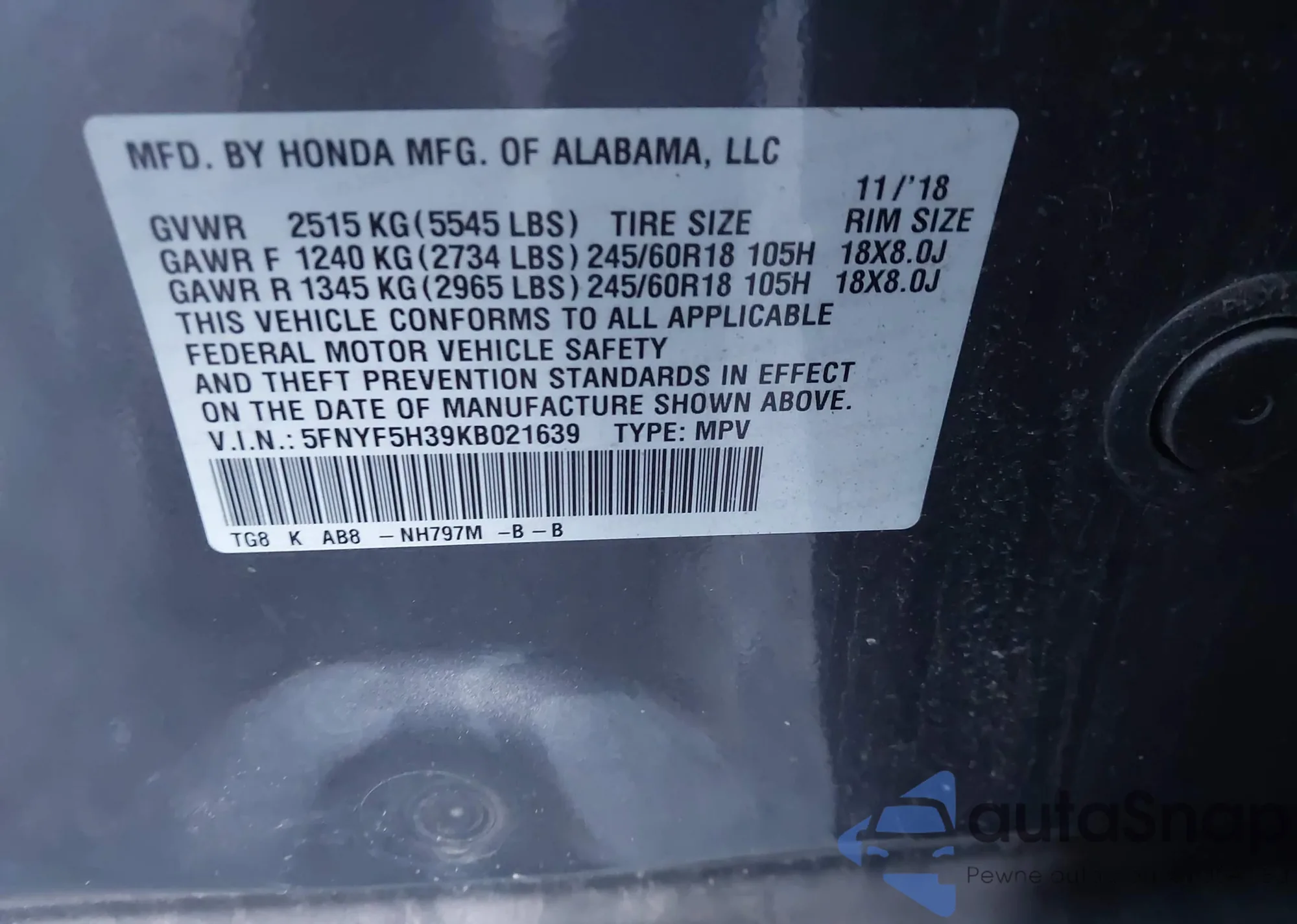 Samochód Honda Pilot 2019 (VIN 5FNYF5H39KB021639) nie był wcześniej licytowany. Dokumenty są czyste, przebieg odpowiada lub jest niższy niż średnia rynku. Sprzedaje go firma ubezpieczeniowa – polecamy zakup. Dostawa do portu zajmie ok. 6–8 tygodni.
