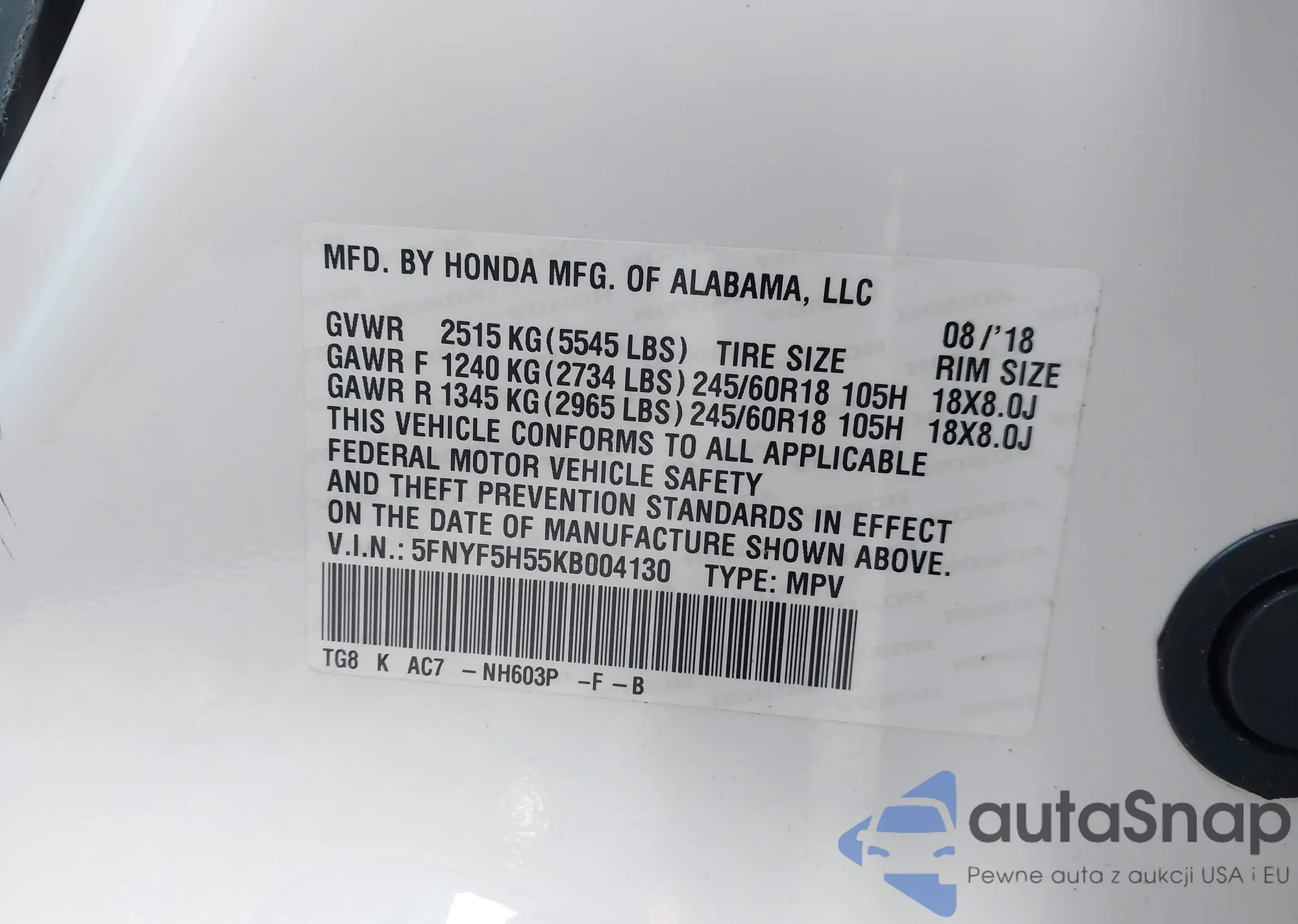VIN: 5FNYF5H55KB004130
