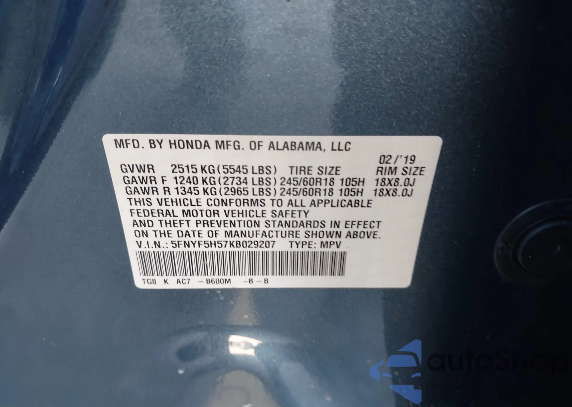 • VIN: 5FNYF5H57KB029207