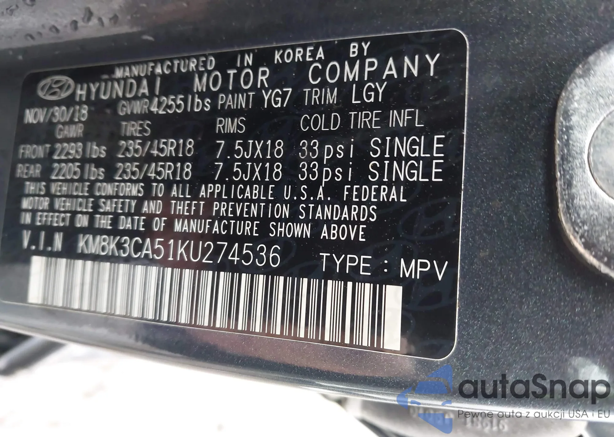 • VIN: KM8K3CA51KU274536
