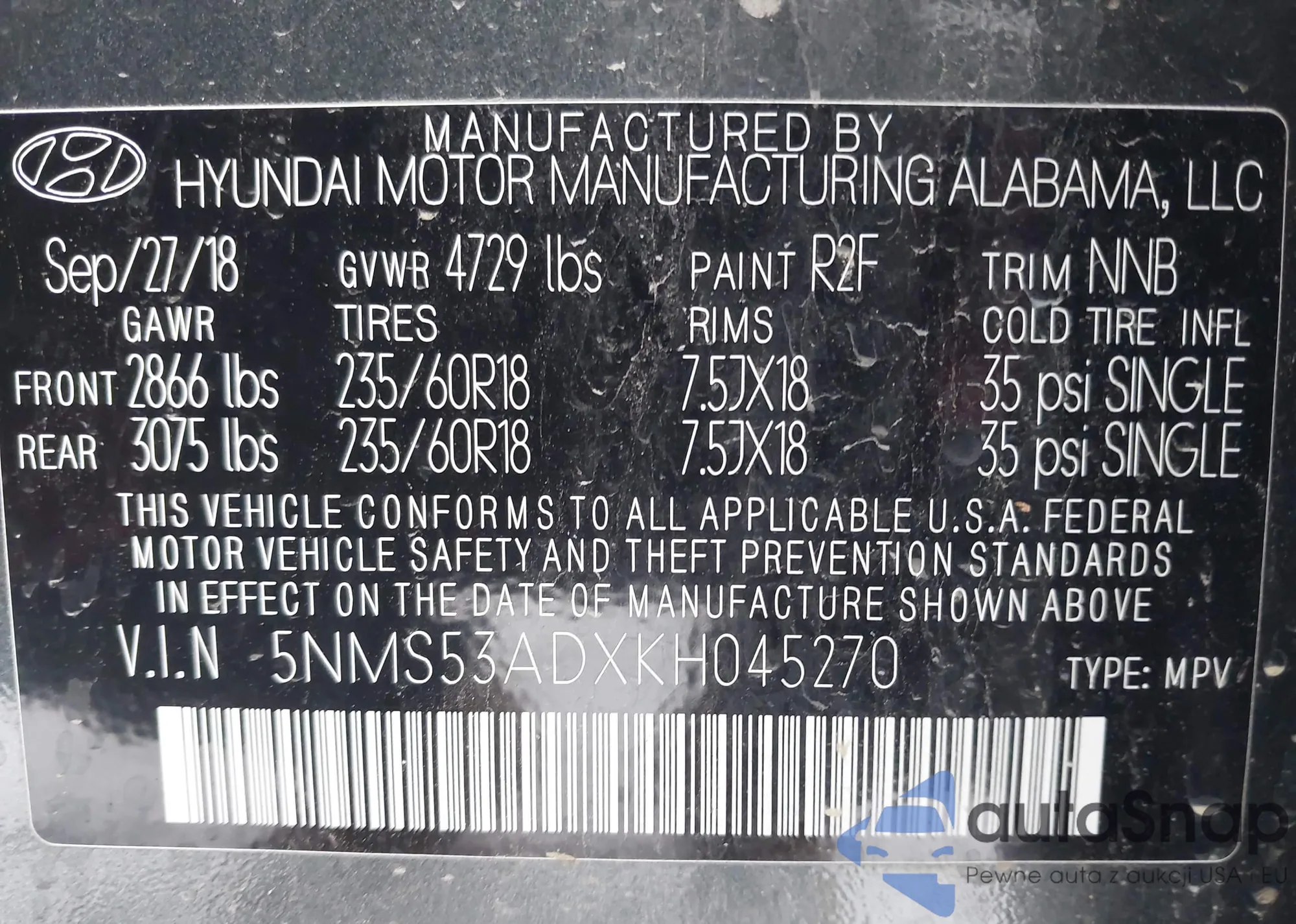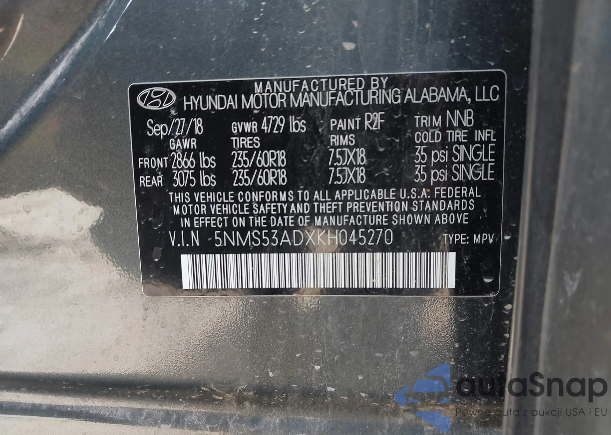 Samochód Hyundai Santa Fe 2019 (VIN 5NMS53ADXKH045270) nie był wcześniej licytowany. Dokumenty są czyste, przebieg odpowiada lub jest niższy niż średnia rynku. Sprzedaje go firma ubezpieczeniowa – polecamy zakup. Dostawa do portu zajmie ok. 6–8 tygodni.