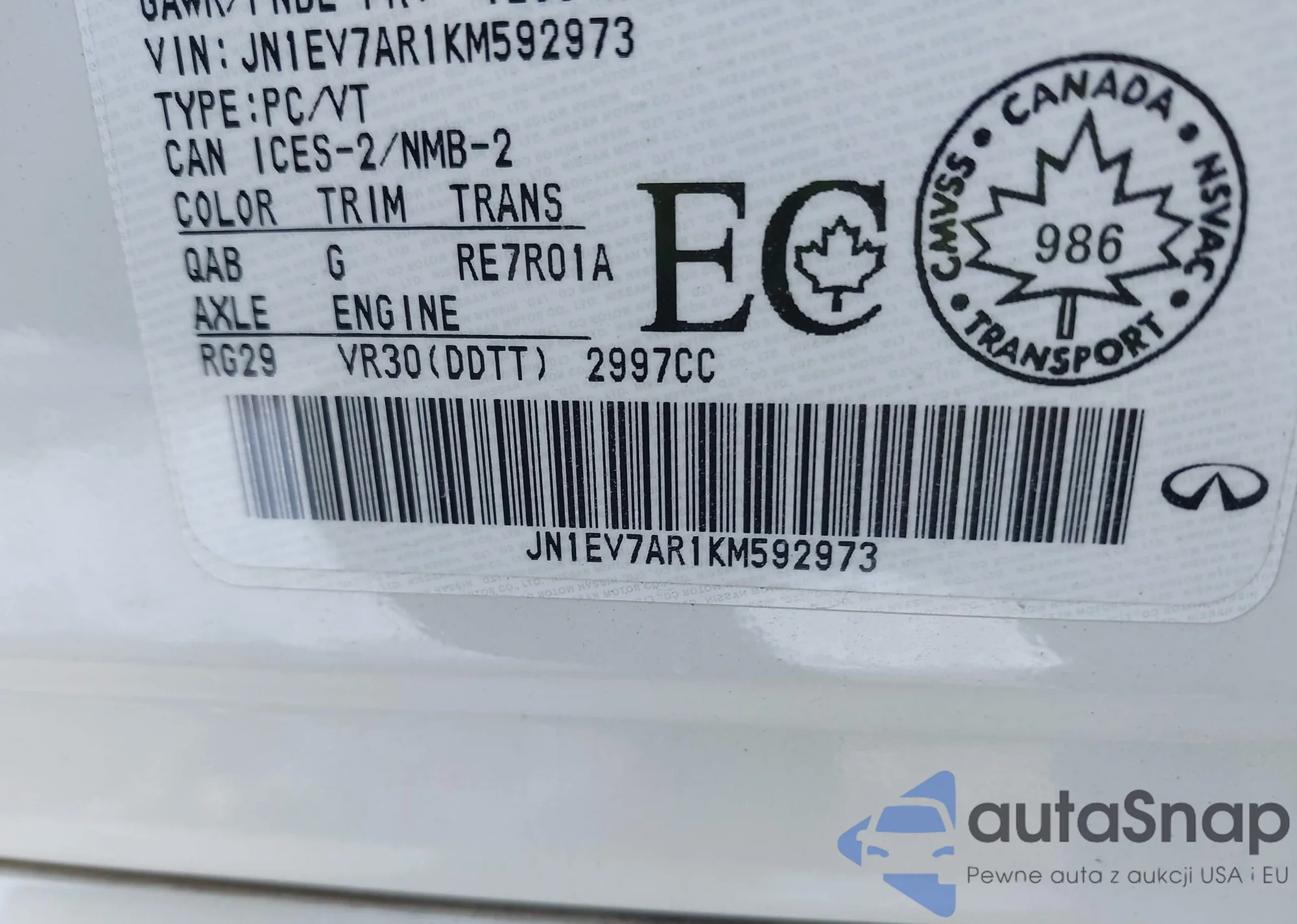 • VIN: JN1EV7AR1KM592973