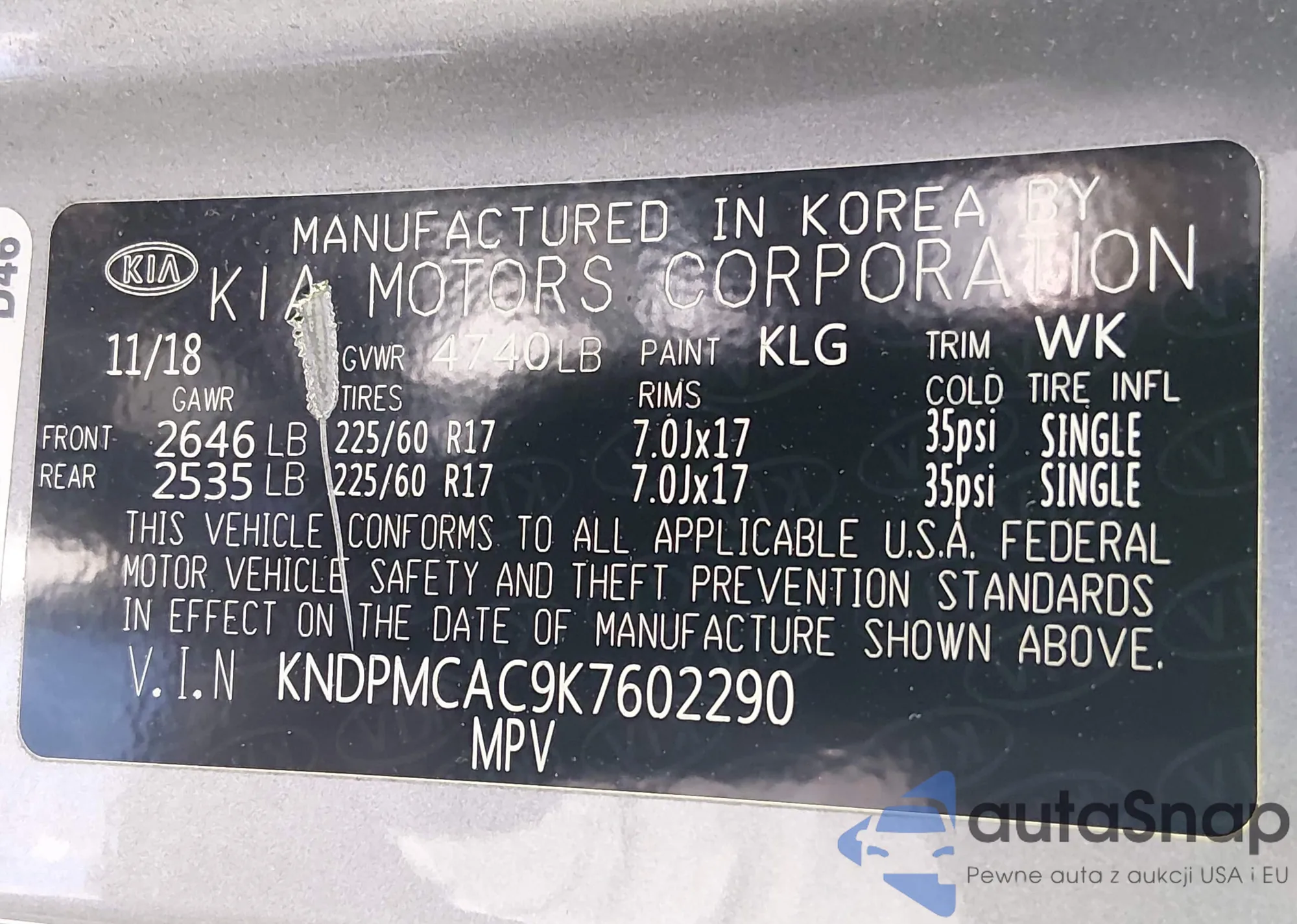 Samochód Kia Sportage 2019 (VIN KNDPMCAC9K7602290) nie był wcześniej licytowany. Dokumenty są czyste, przebieg odpowiada lub jest niższy niż średnia rynku. Sprzedaje go firma ubezpieczeniowa – polecamy zakup. Dostawa do portu zajmie ok. 6–8 tygodni.