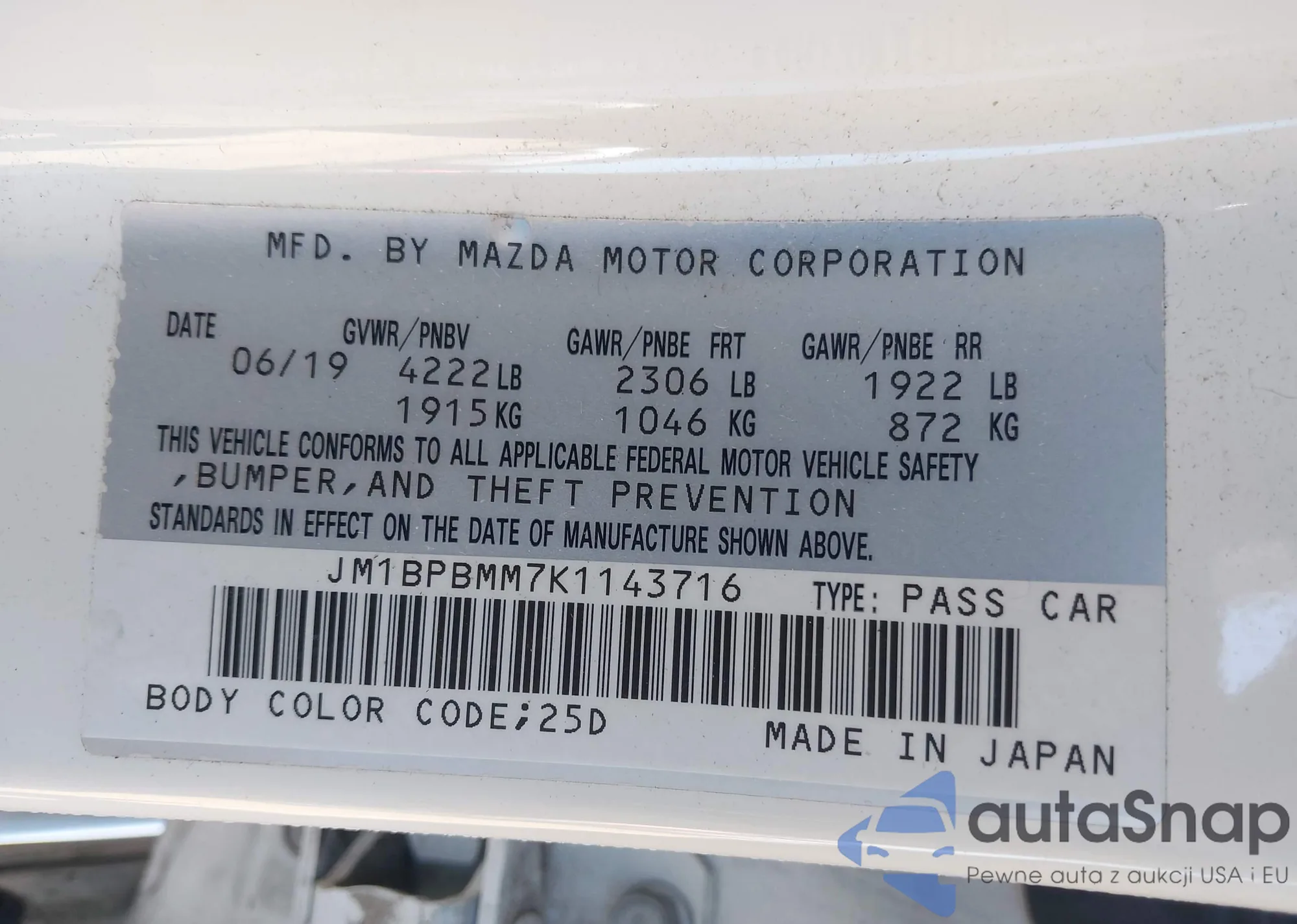 Samochód Mazda 3 2019 (VIN JM1BPBMM7K1143716) nie był wcześniej licytowany. Dokumenty są czyste, przebieg odpowiada lub jest niższy niż średnia rynku. Sprzedaje go firma ubezpieczeniowa – polecamy zakup. Dostawa do portu zajmie ok. 6–8 tygodni.