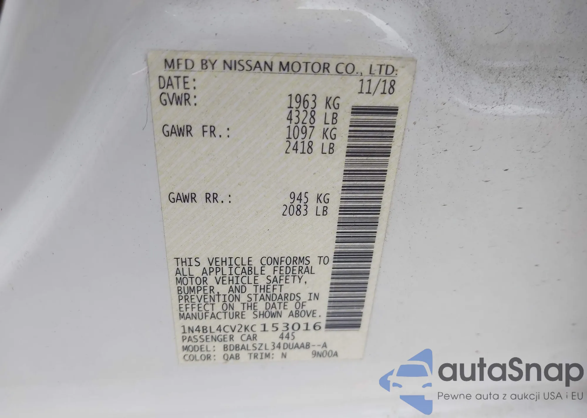 • VIN: 1N4BL4CV2KC153016