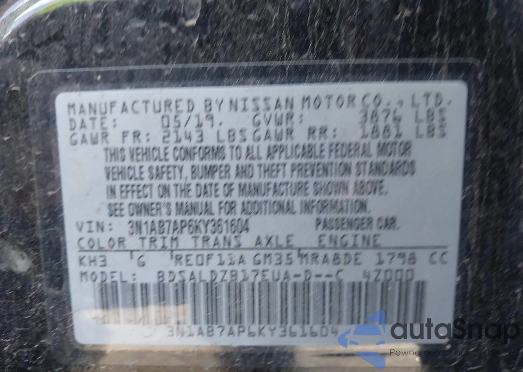 Samochód Nissan Sentra 2019 (VIN 3N1AB7AP6KY361604) nie był wcześniej licytowany. Dokumenty są czyste, przebieg odpowiada lub jest niższy niż średnia rynku. Sprzedaje go firma ubezpieczeniowa – polecamy zakup. Dostawa do portu zajmie ok. 6–8 tygodni.