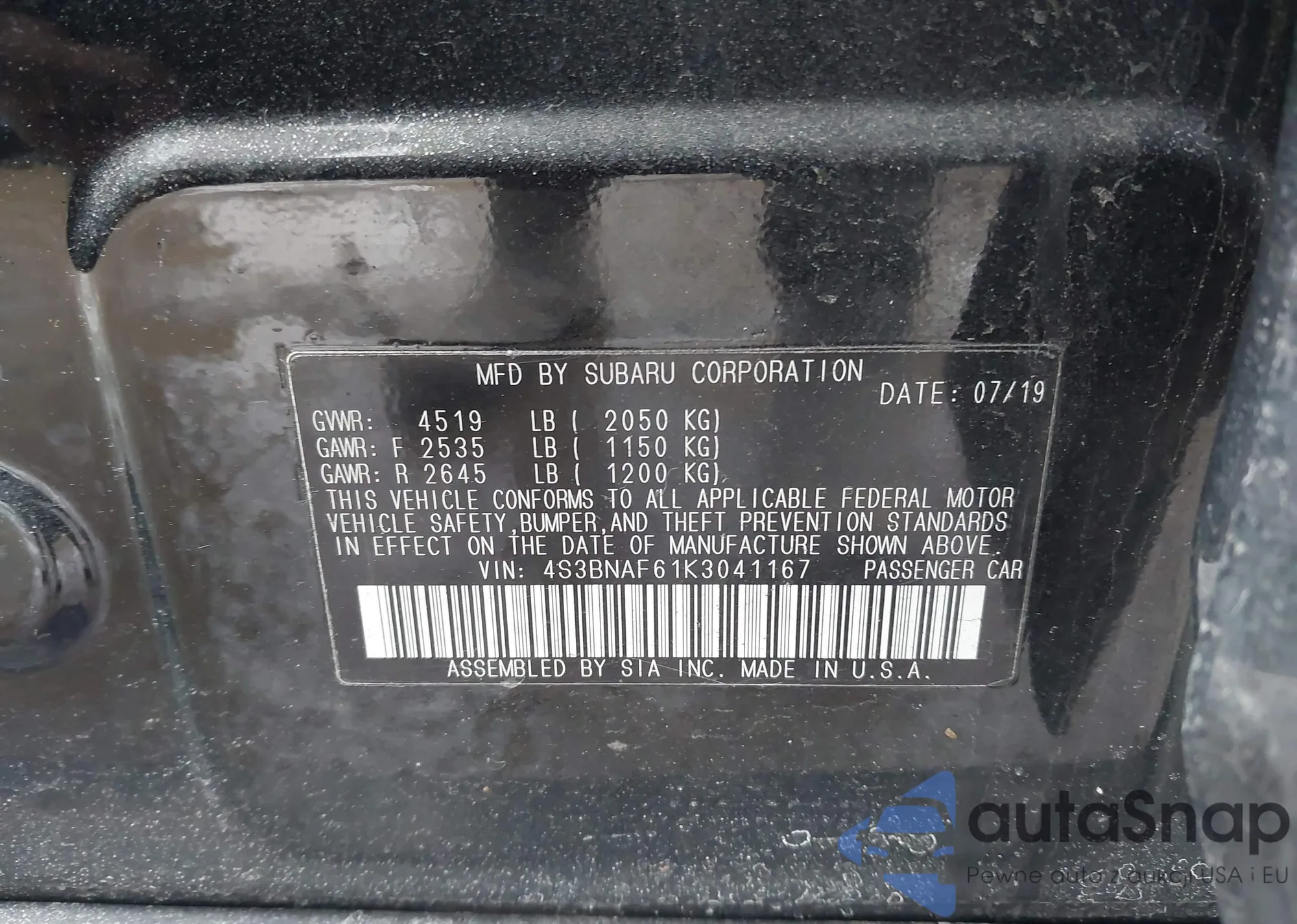 Samochód Subaru Legacy 2019 (VIN 4S3BNAF61K3041167) nie był wcześniej licytowany. Dokumenty są czyste, przebieg odpowiada lub jest niższy niż średnia rynku. Sprzedaje go firma ubezpieczeniowa – polecamy zakup. Dostawa do portu zajmie ok. 6–8 tygodni.