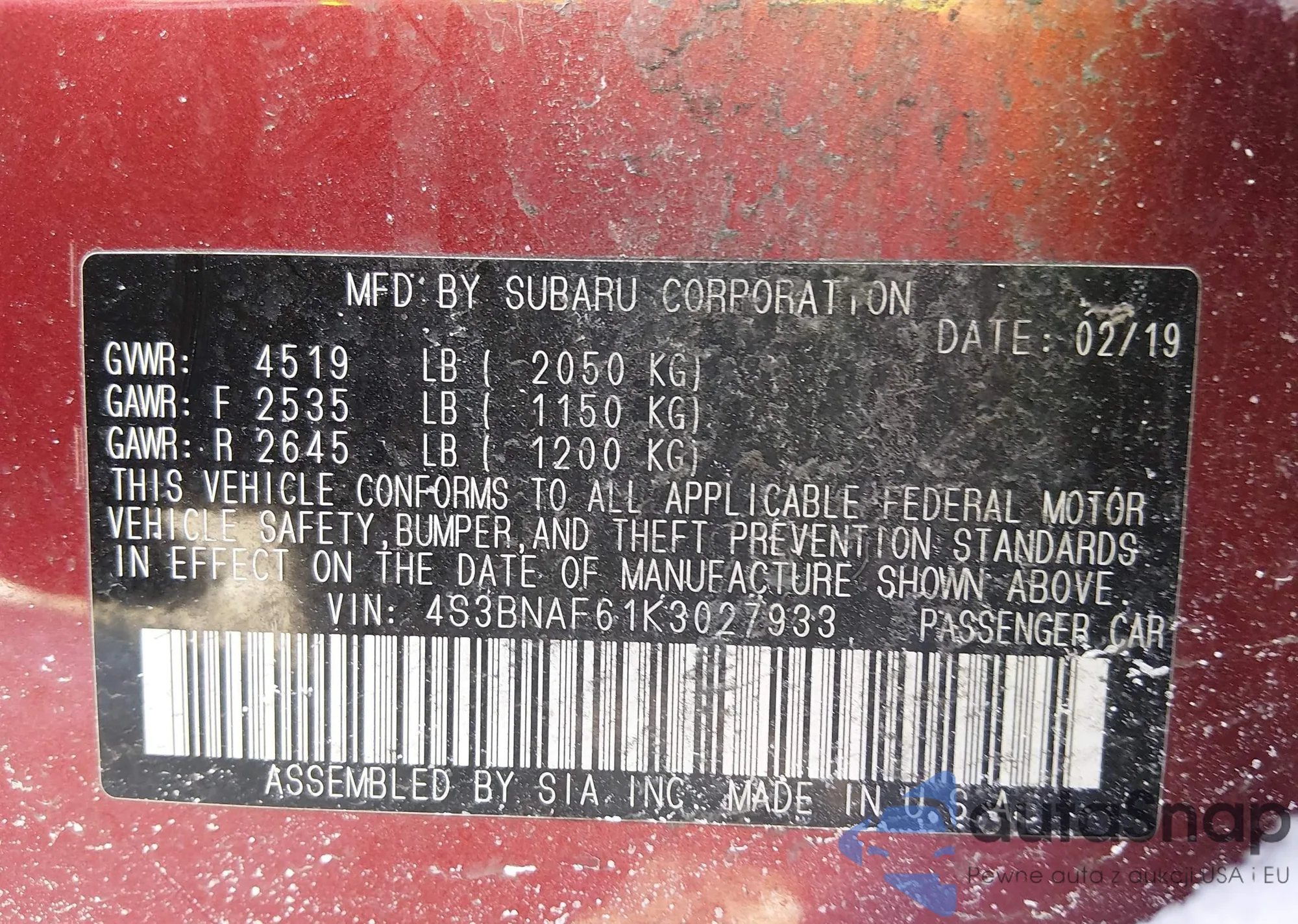 Samochód Subaru Legacy 2019 (VIN 4S3BNAF61K3027933) nie był wcześniej licytowany. Dokumenty są czyste, przebieg odpowiada lub jest niższy niż średnia rynku. Sprzedaje go firma ubezpieczeniowa – polecamy zakup. Dostawa do portu zajmie ok. 6–8 tygodni.