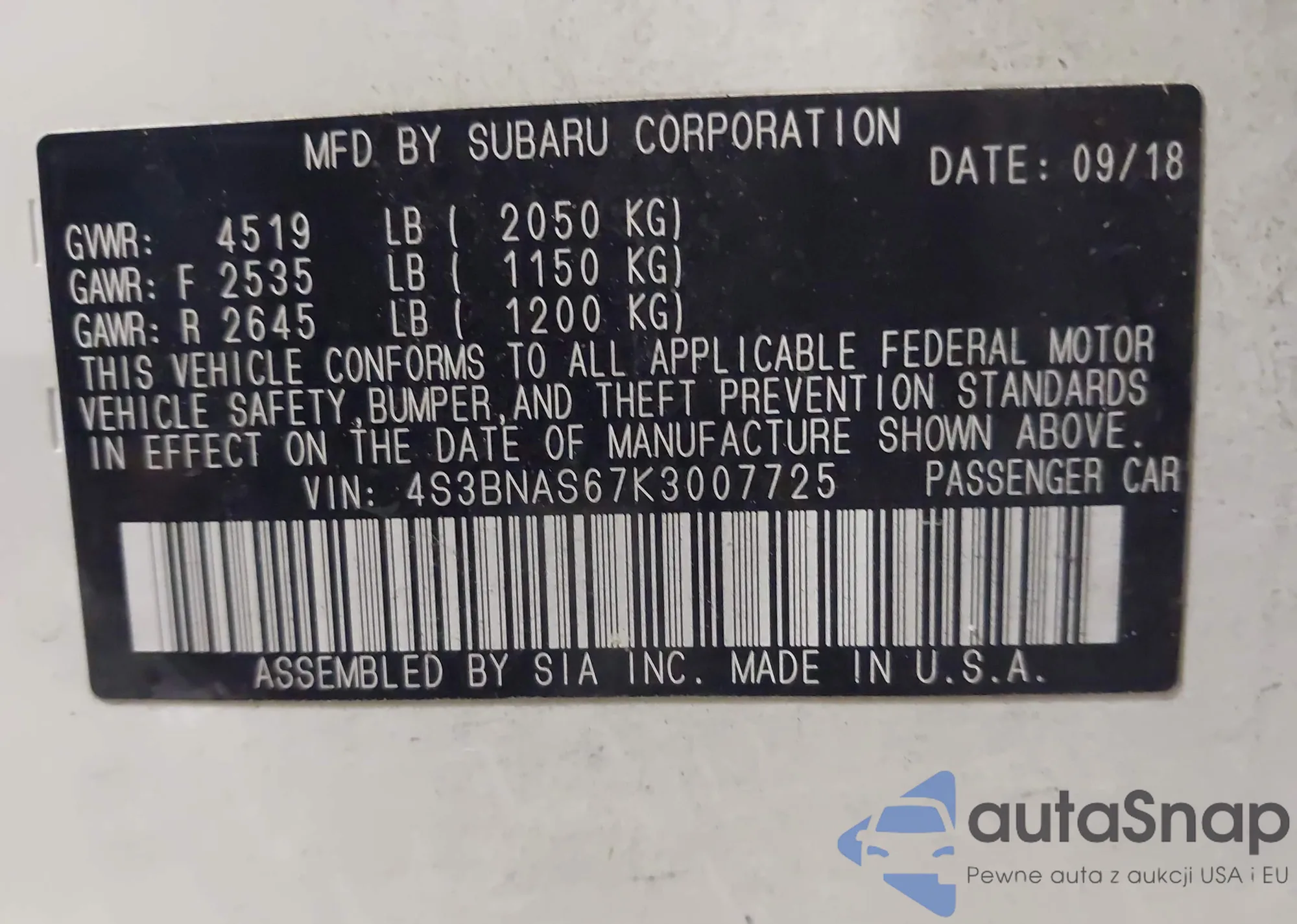 VIN: 4S3BNAS67K3007725