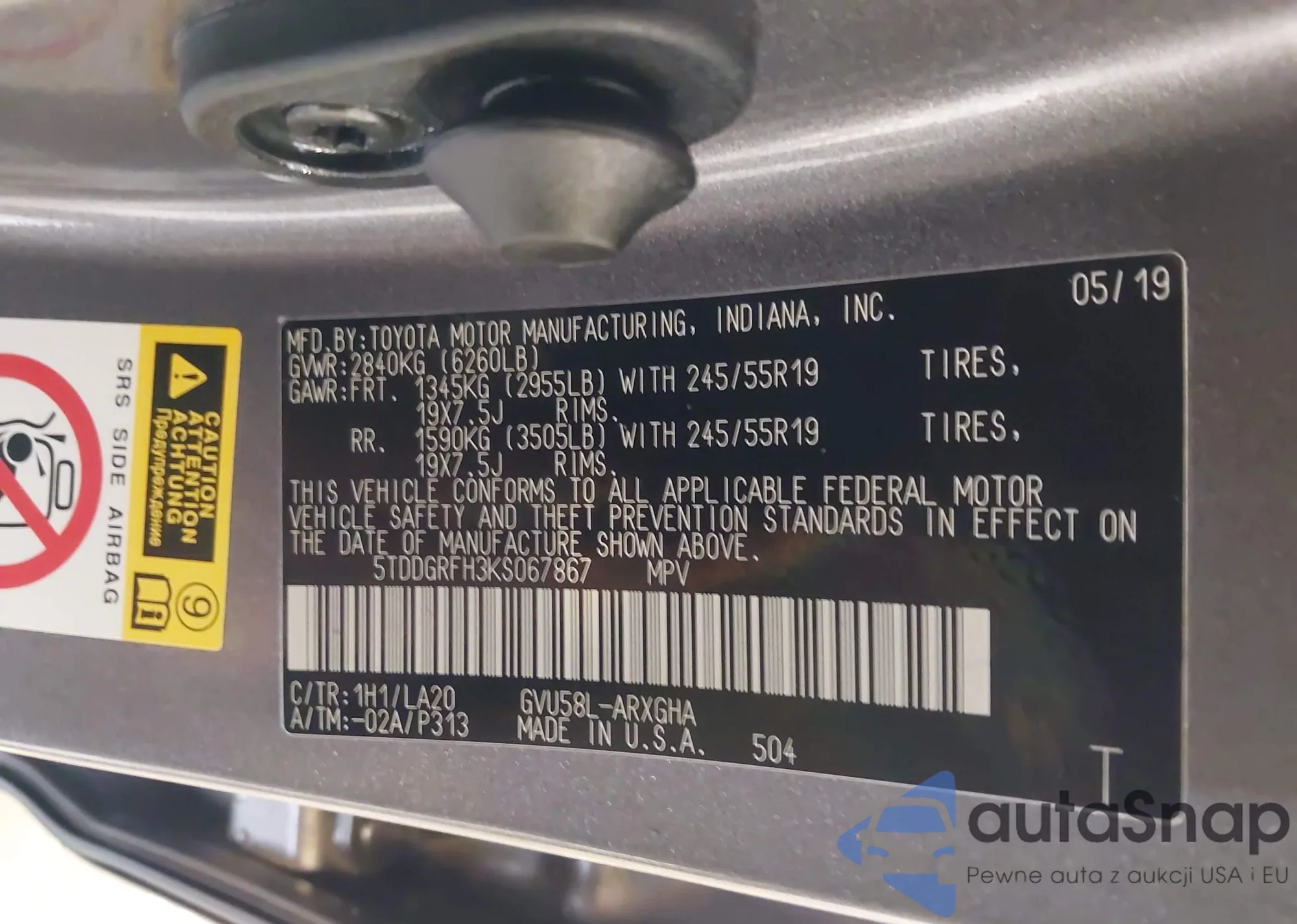VIN: 5TDDGRFH3KS067867