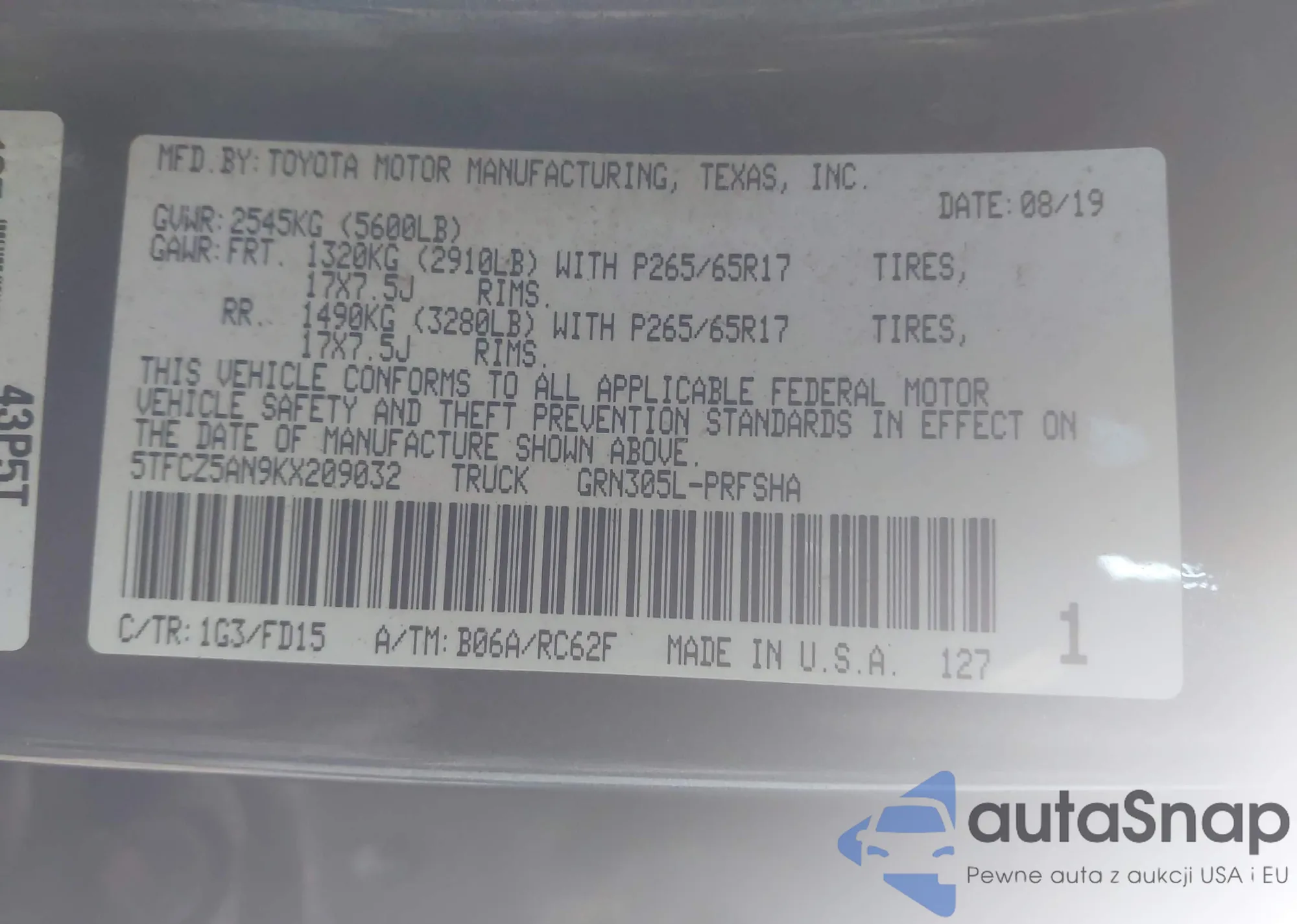 VIN: 5TFCZ5AN9KX209032