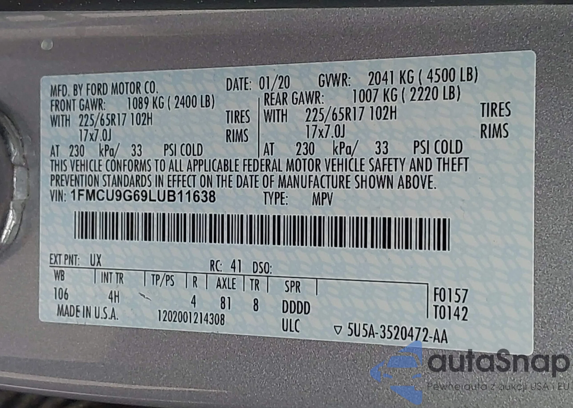 VIN: 1FMCU9G69LUB11638