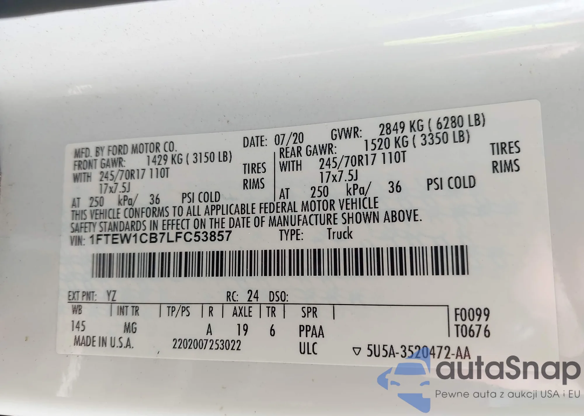 Samochód Ford F-150 2020 (VIN 1FTEW1CB7LFC53857) ma dokumenty uniemożliwiające rejestrację. Mogą pojawić się trudności przy eksporcie i rejestracji. Skontaktuj się z ekspertami AutaSnap w celu znalezienia alternatywy.