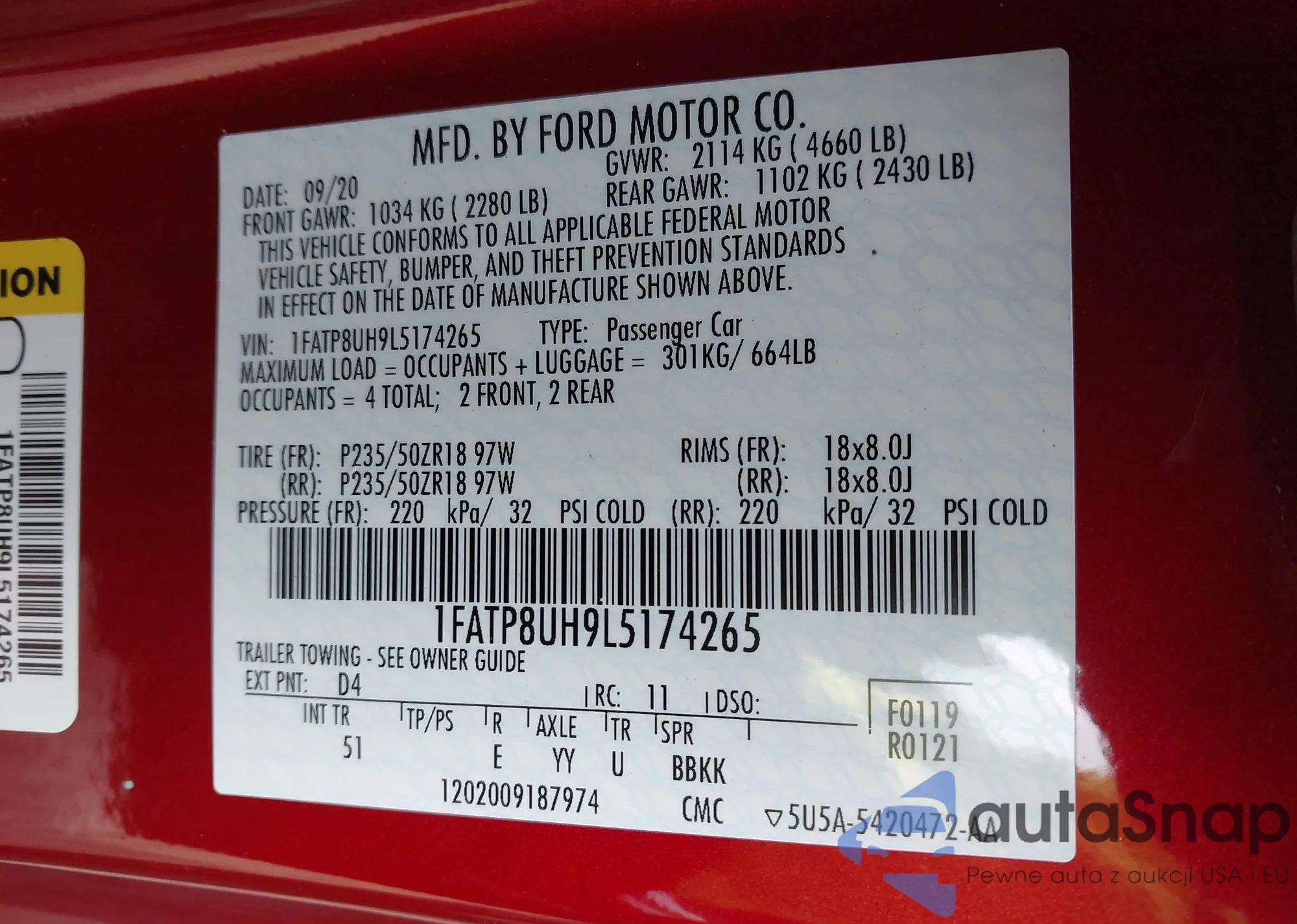 Samochód Ford Mustang 2020 (VIN 1FATP8UH9L5174265) nie był wcześniej licytowany. Dokumenty są czyste, przebieg odpowiada lub jest niższy niż średnia rynku. Sprzedaje go firma ubezpieczeniowa – polecamy zakup. Dostawa do portu zajmie ok. 6–8 tygodni.