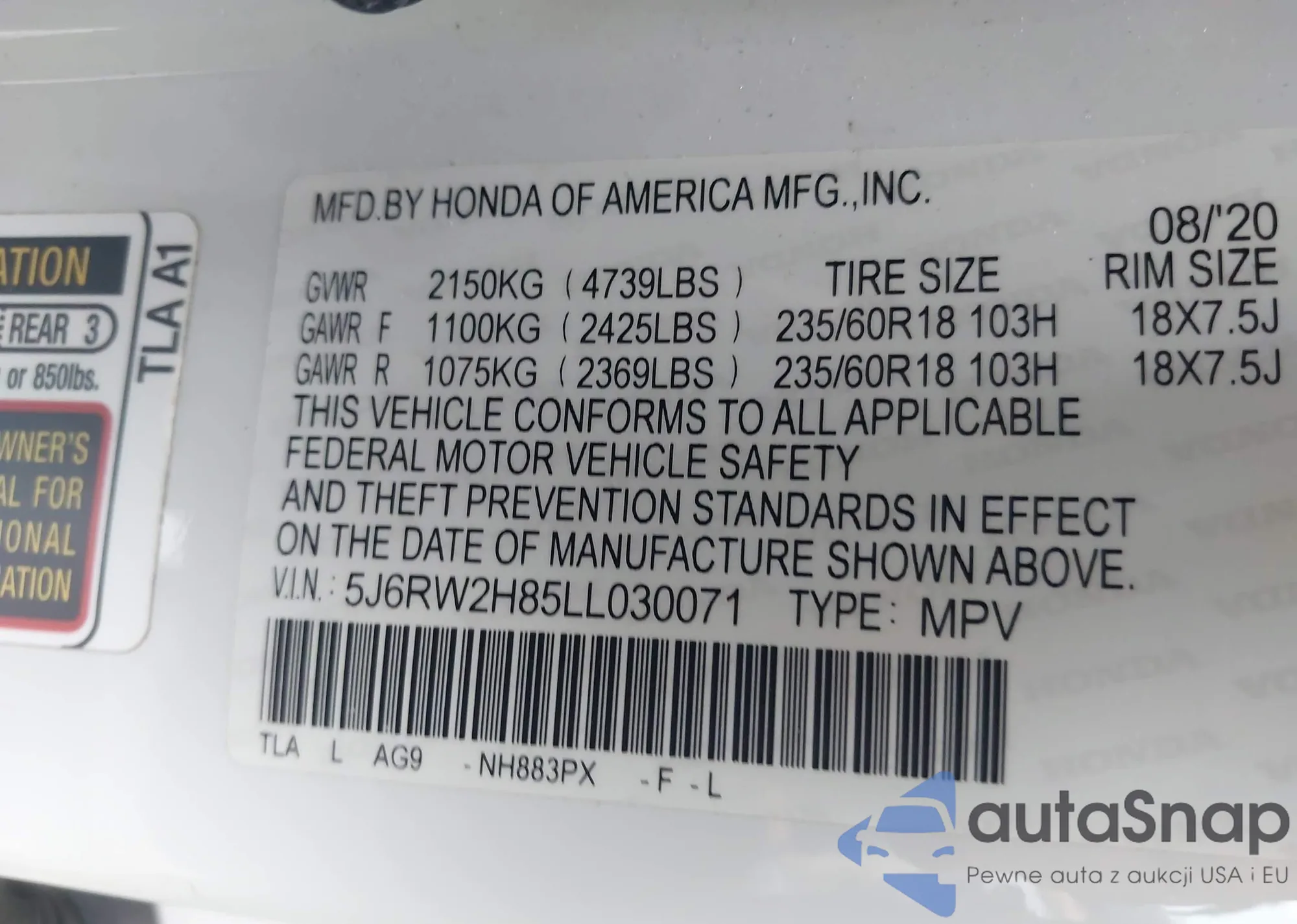 VIN: 5J6RW2H85LL030071