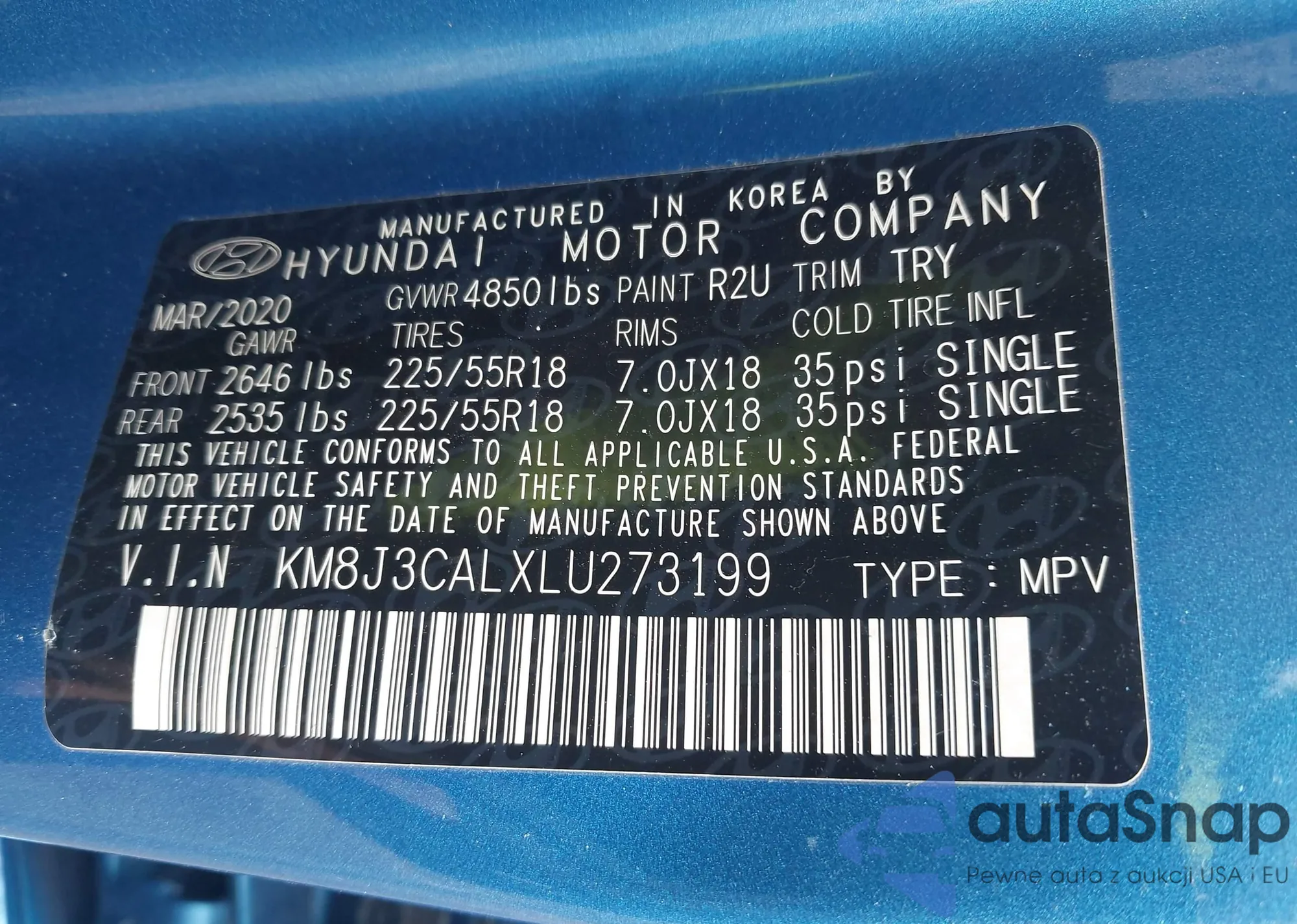 Samochód Hyundai Tucson 2020 (VIN KM8J3CALXLU273199) nie był wcześniej licytowany. Dokumenty są czyste, przebieg odpowiada lub jest niższy niż średnia rynku. Sprzedaje go firma ubezpieczeniowa – polecamy zakup. Dostawa do portu zajmie ok. 6–8 tygodni.