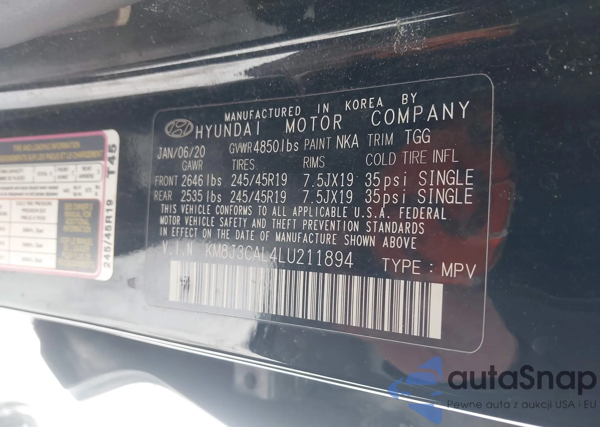 Samochód Hyundai Tucson 2020 (VIN KM8J3CAL4LU211894) nie był wcześniej licytowany. Dokumenty są czyste, przebieg odpowiada lub jest niższy niż średnia rynku. Sprzedaje go firma ubezpieczeniowa – polecamy zakup. Dostawa do portu zajmie ok. 6–8 tygodni.