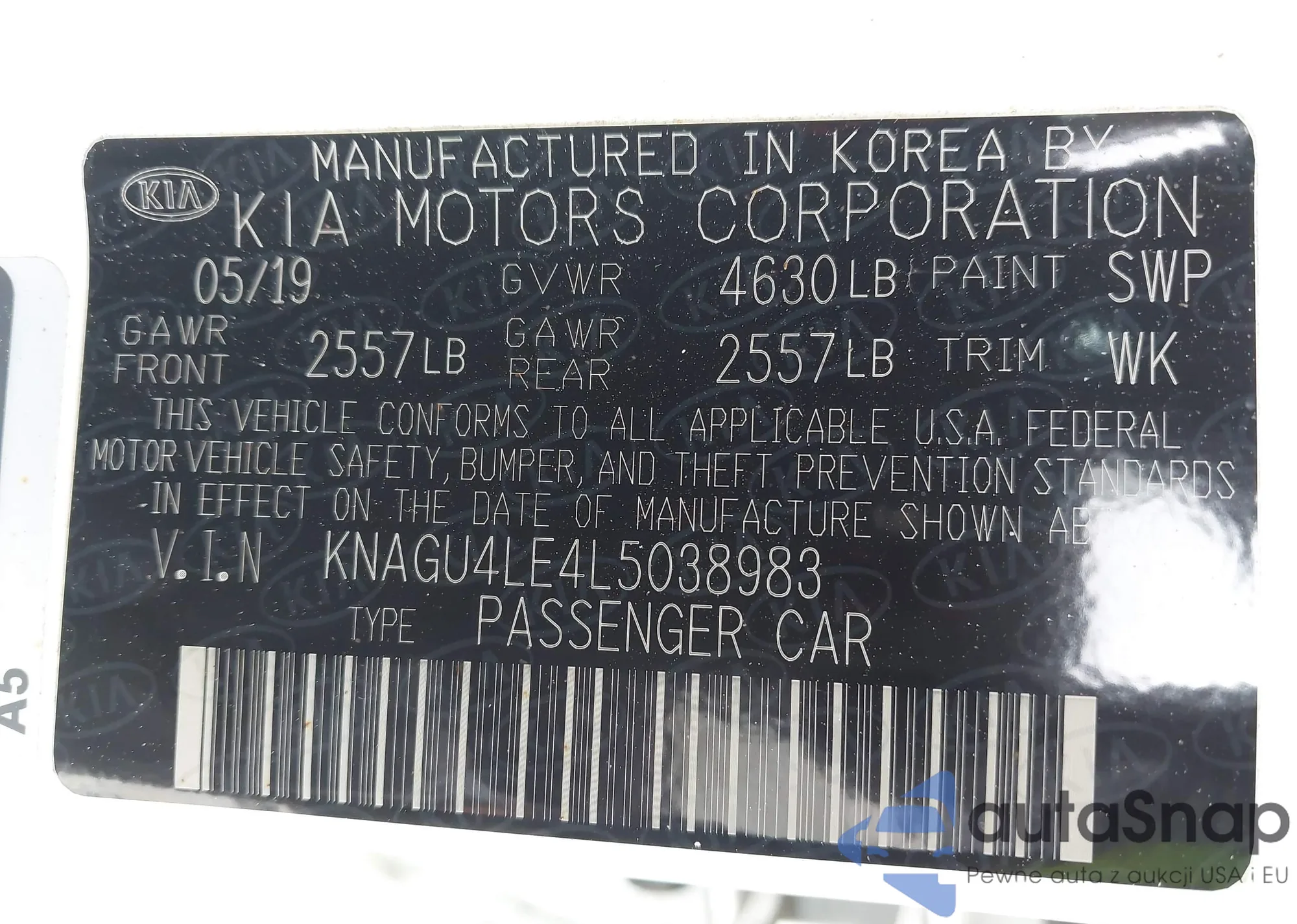 • VIN: KNAGU4LE4L5038983