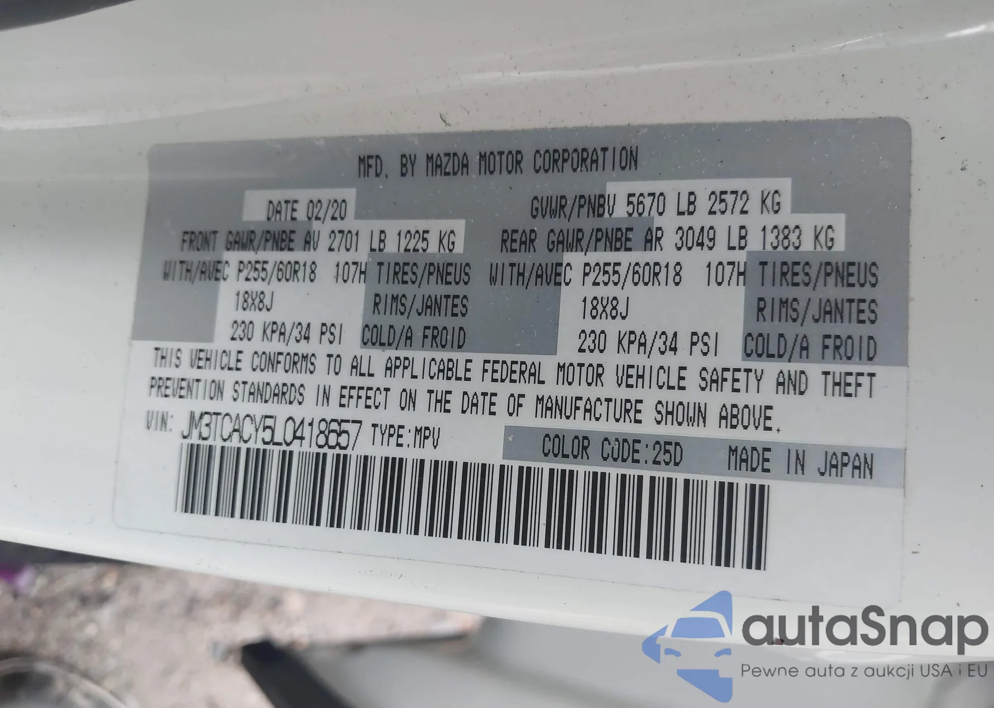 • VIN: JM3TCACY5L0418657