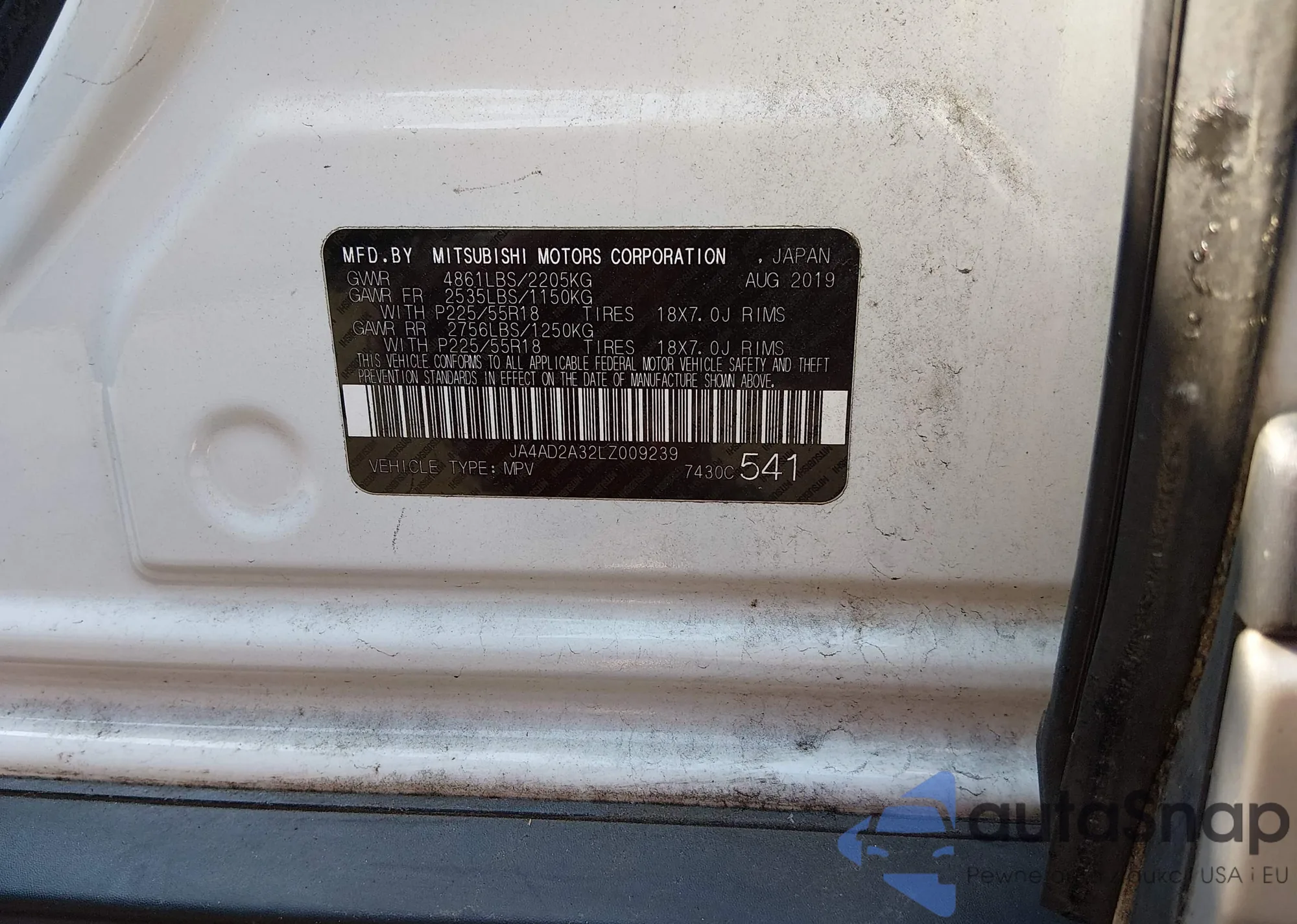 Samochód Mitsubishi Outlander 2020 (VIN JA4AD2A32LZ009239) nie był wcześniej licytowany. Dokumenty są czyste, przebieg odpowiada lub jest niższy niż średnia rynku. Sprzedaje go firma ubezpieczeniowa – polecamy zakup. Dostawa do portu zajmie ok. 6–8 tygodni.