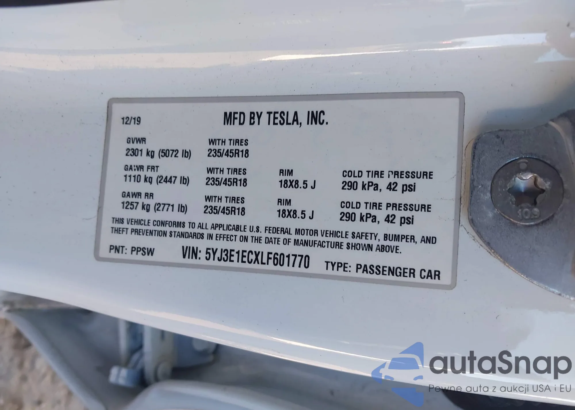 Samochód Tesla Model 3 2020 (VIN 5YJ3E1ECXLF601770) nie był wcześniej licytowany. Dokumenty są czyste, przebieg odpowiada lub jest niższy niż średnia rynku. Sprzedaje go firma ubezpieczeniowa – polecamy zakup. Dostawa do portu zajmie ok. 6–8 tygodni.