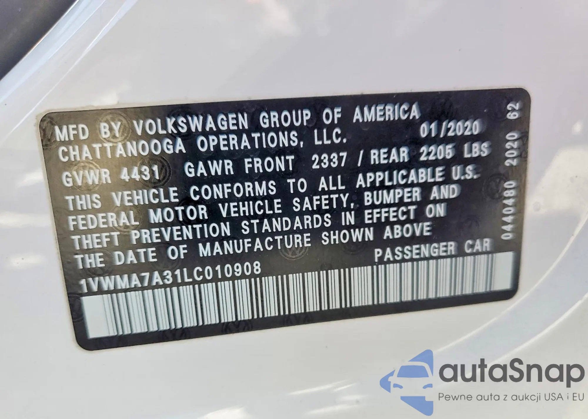 1VWMA7A31LC010908 COPART