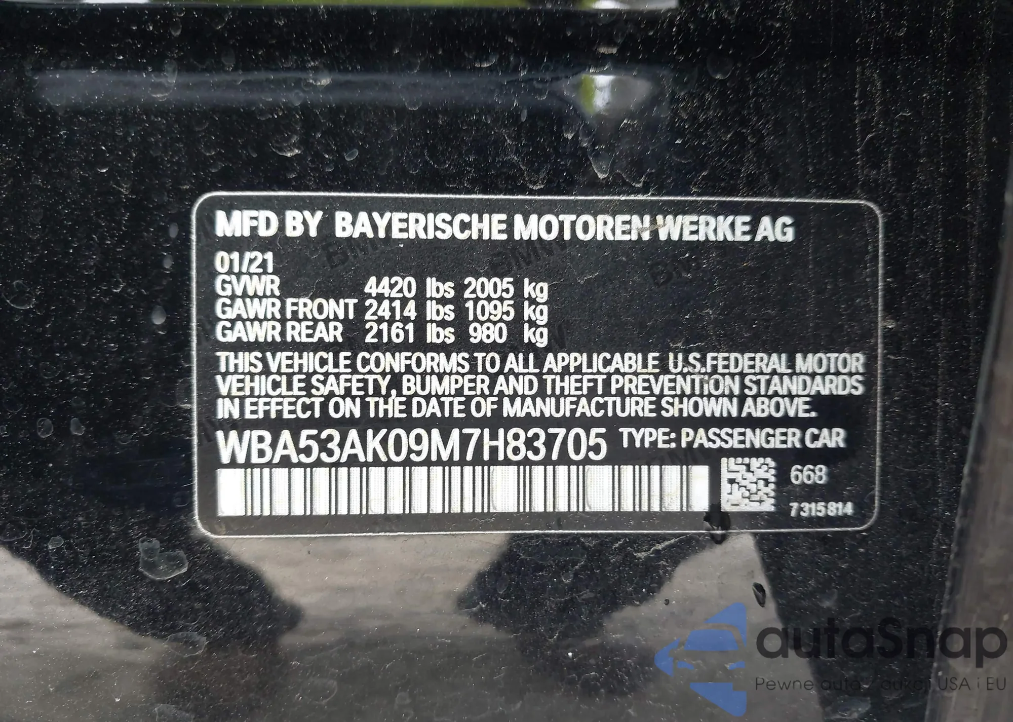 VIN: WBA53AK09M7H83705