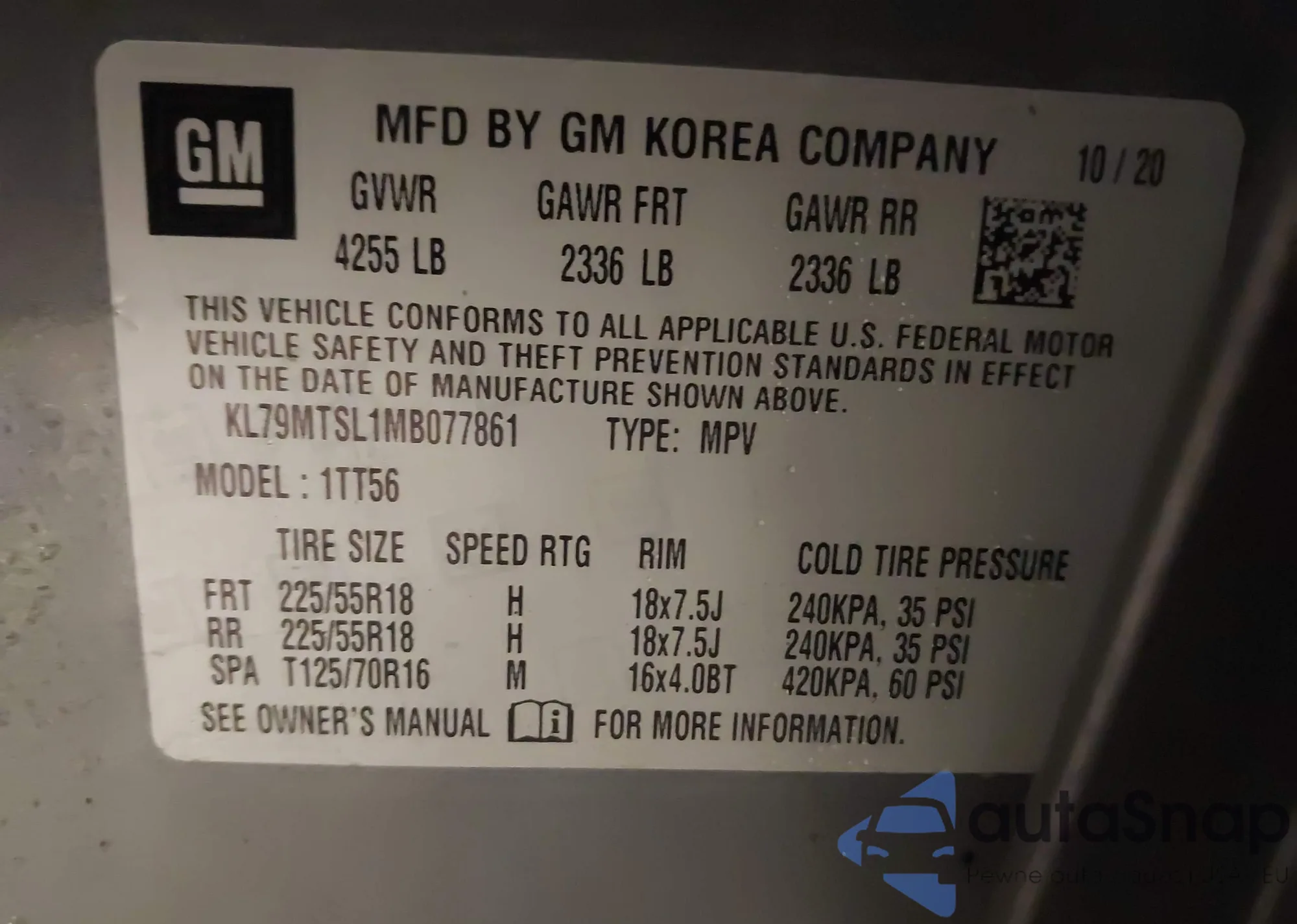 • VIN: KL79MTSL1MB077861