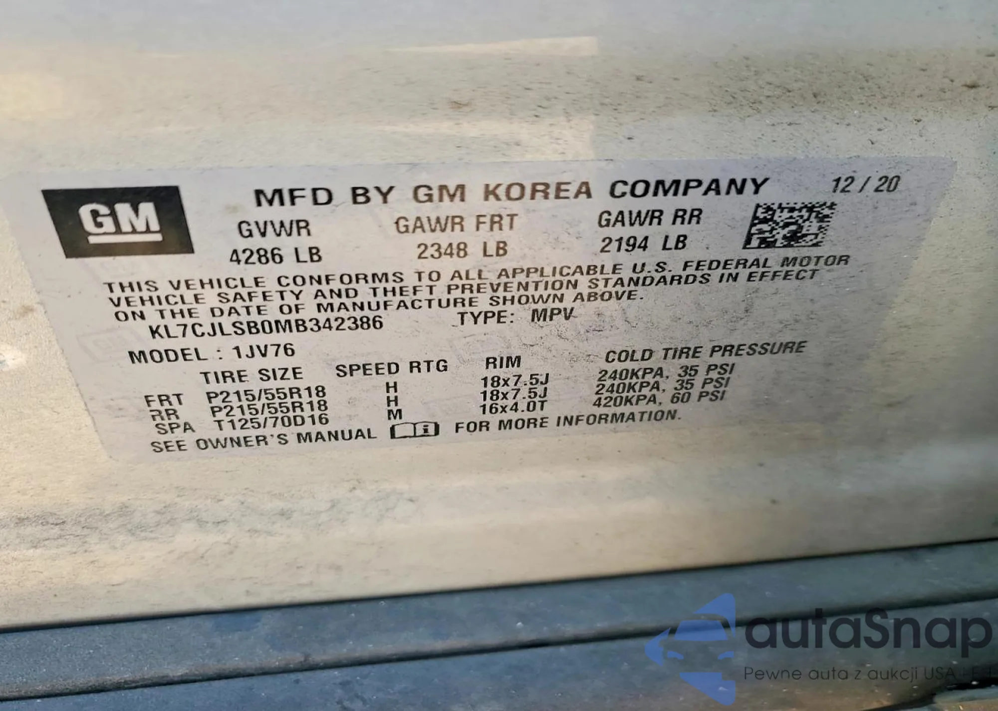 VIN: KL7CJLSB0MB342386