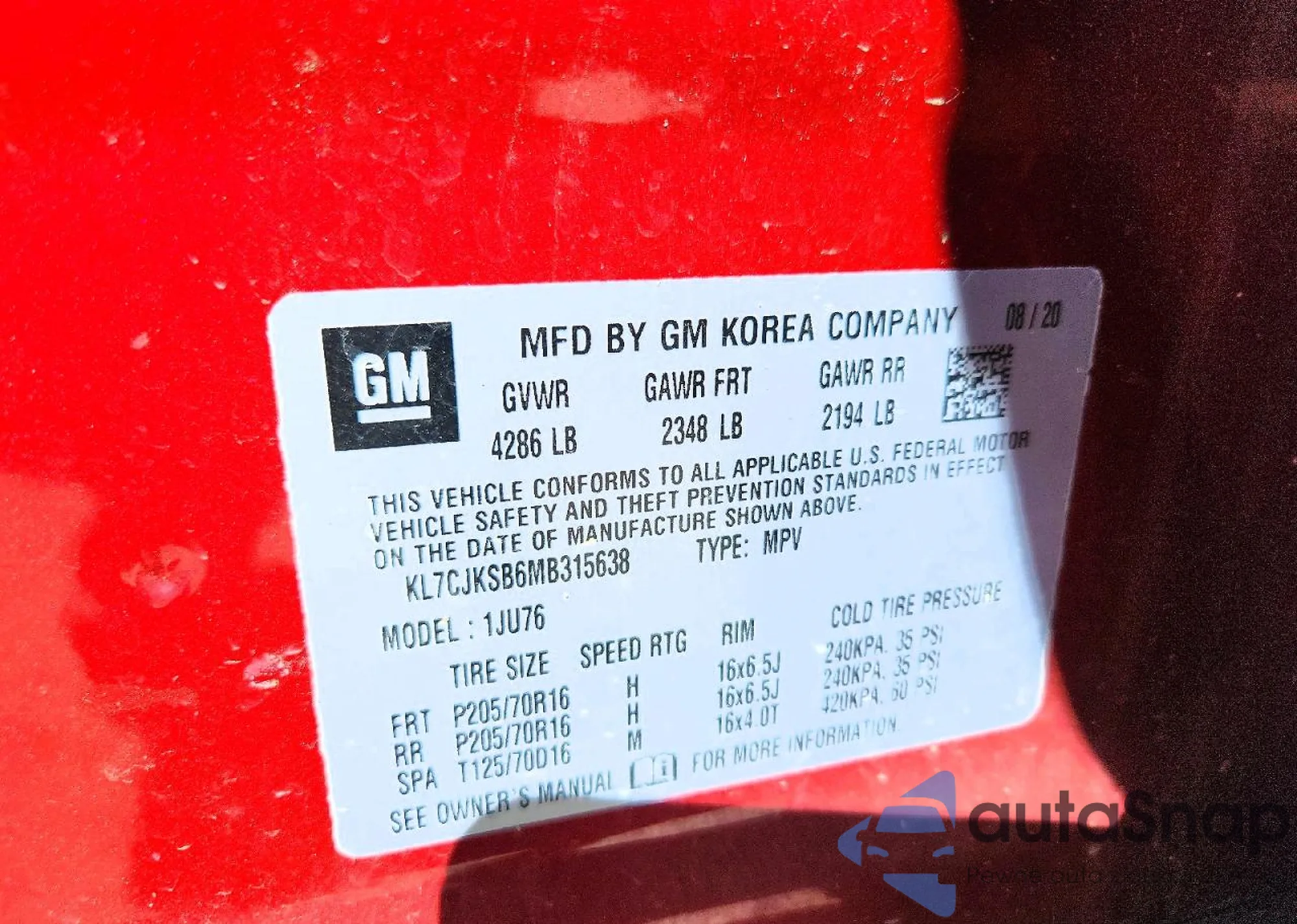 • VIN: KL7CJKSB6MB315638