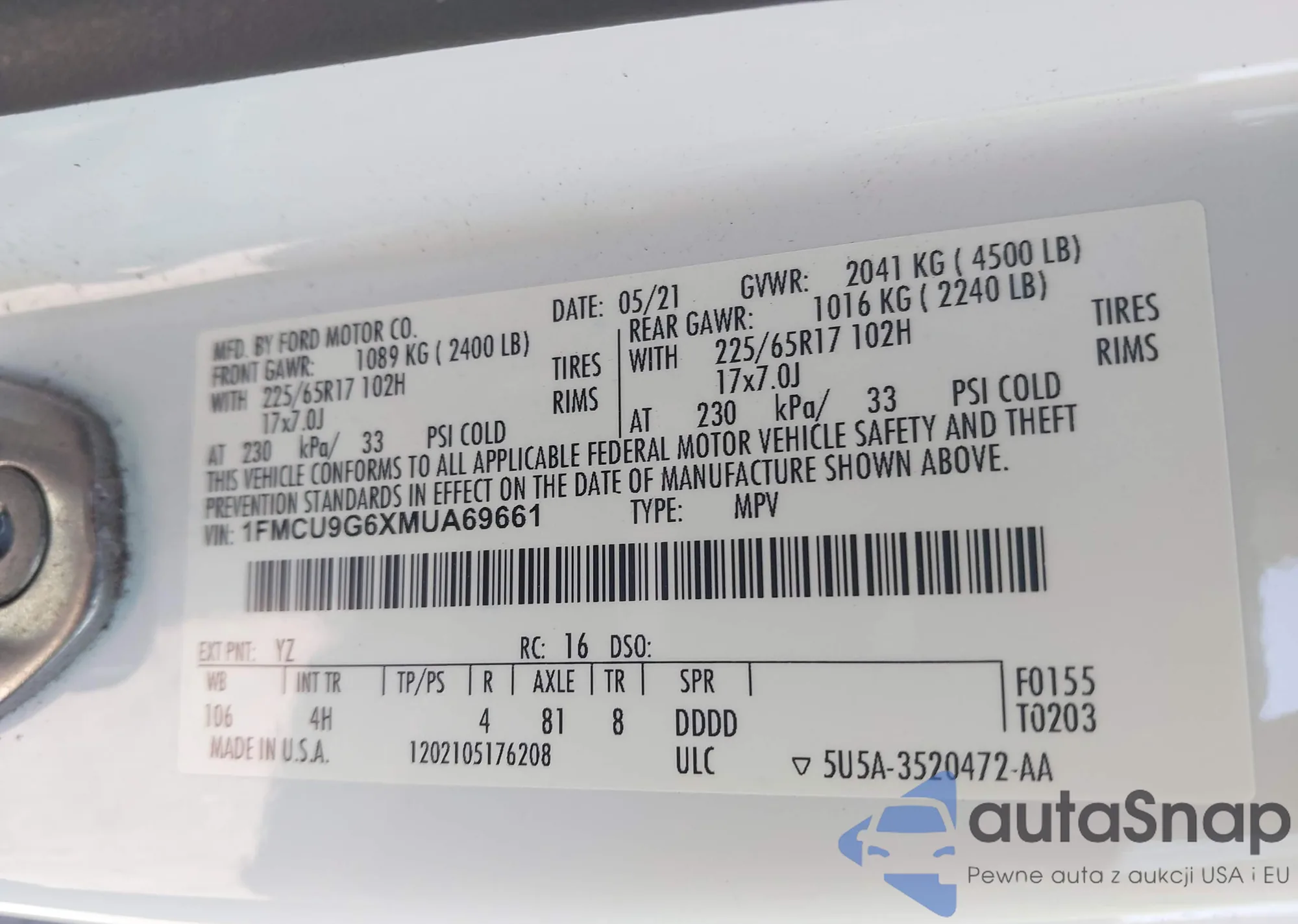 • VIN: 1FMCU9G6XMUA69661