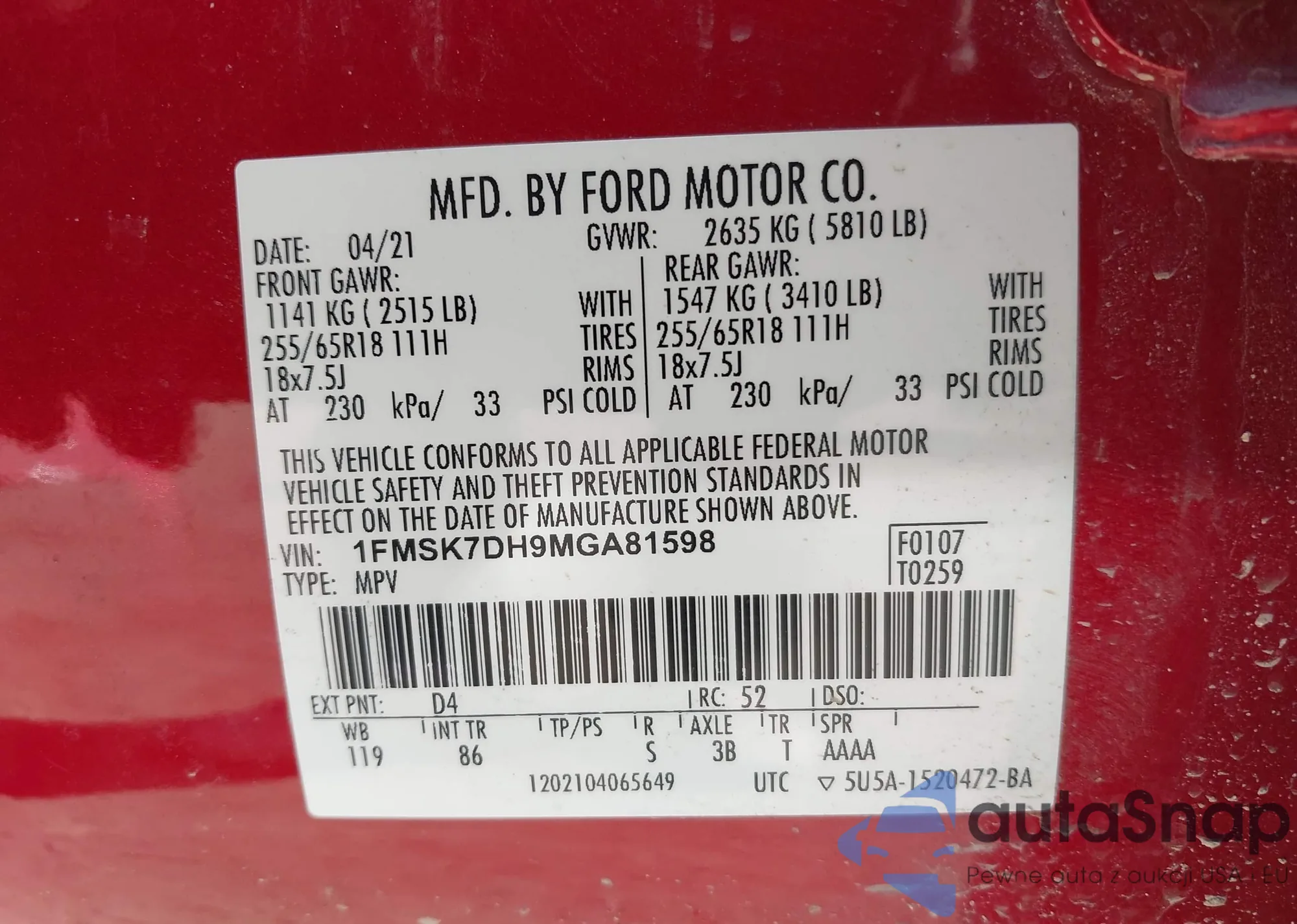 • VIN: 1FMSK7DH9MGA81598