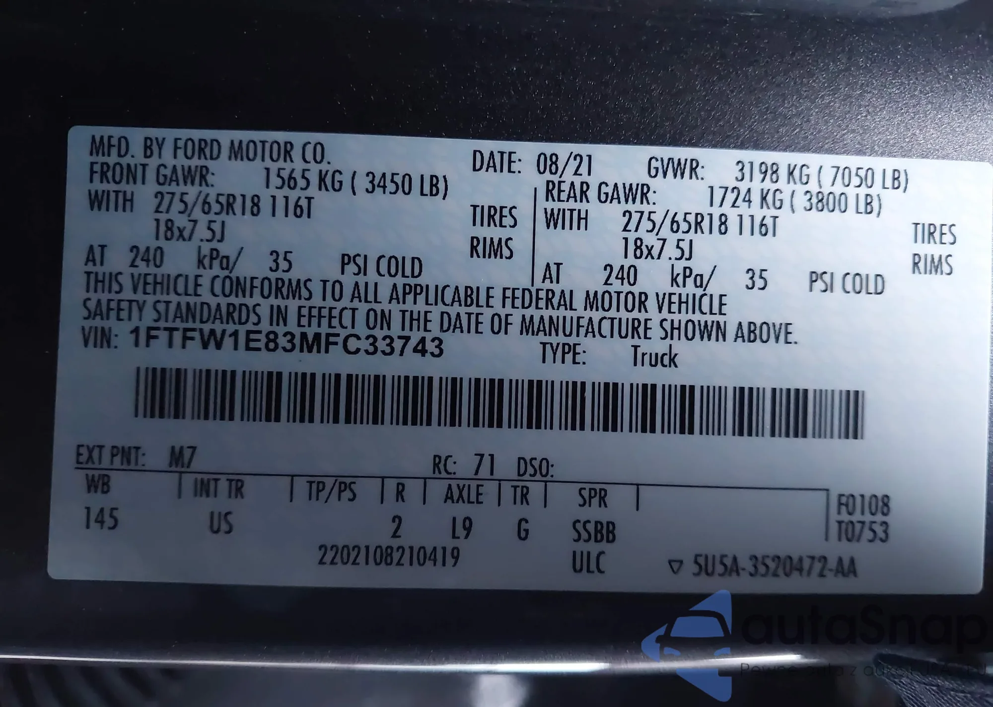 Samochód Ford F-150 2021 (VIN 1FTFW1E83MFC33743) nie był wcześniej licytowany. Dokumenty są czyste, przebieg odpowiada lub jest niższy niż średnia rynku. Sprzedaje go firma ubezpieczeniowa – polecamy zakup. Dostawa do portu zajmie ok. 6–8 tygodni.