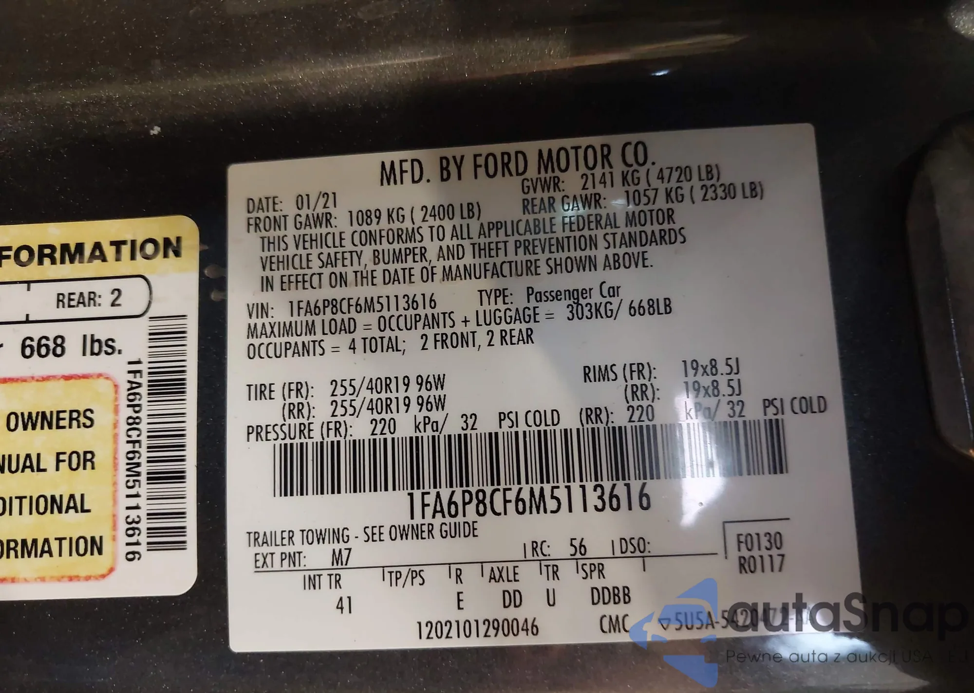 Samochód Ford Mustang 2021 (VIN 1FA6P8CF6M5113616) nie był wcześniej licytowany. Dokumenty są czyste, przebieg odpowiada lub jest niższy niż średnia rynku. Sprzedaje go firma ubezpieczeniowa – polecamy zakup. Dostawa do portu zajmie ok. 6–8 tygodni.