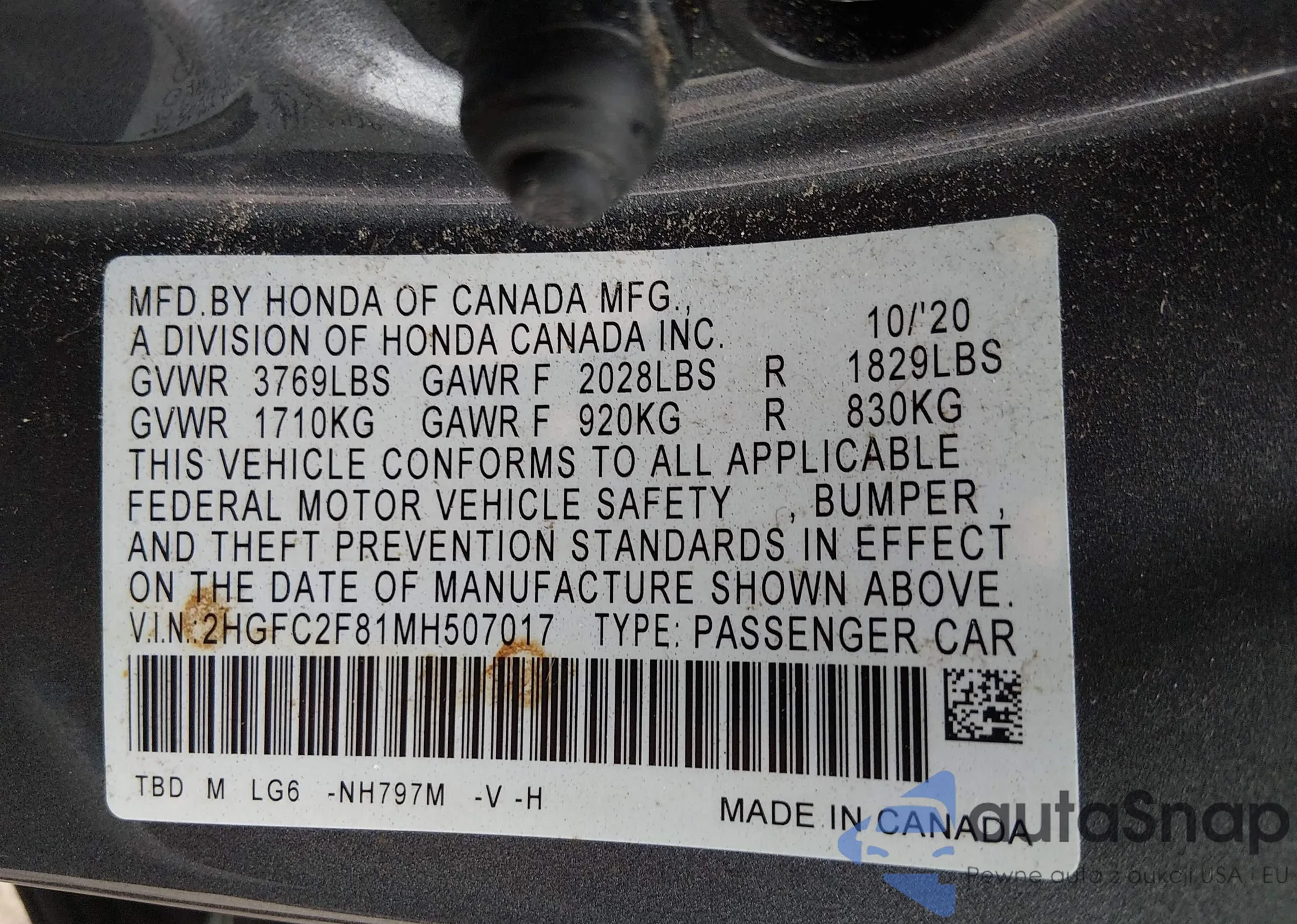 • VIN: 2HGFC2F81MH507017