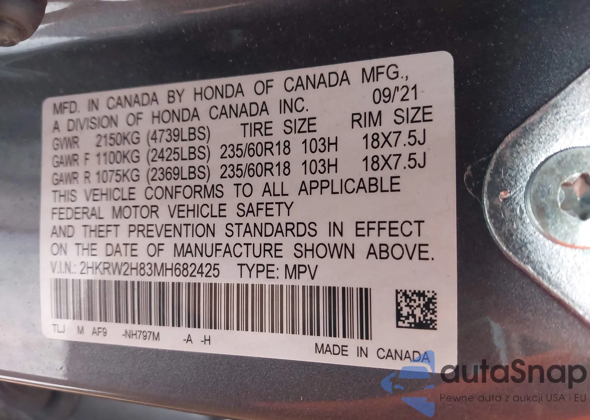 Samochód Honda CR-V 2021 (VIN 2HKRW2H83MH682425) nie był wcześniej licytowany. Dokumenty są czyste, przebieg odpowiada lub jest niższy niż średnia rynku. Sprzedaje go firma ubezpieczeniowa – polecamy zakup. Dostawa do portu zajmie ok. 6–8 tygodni.