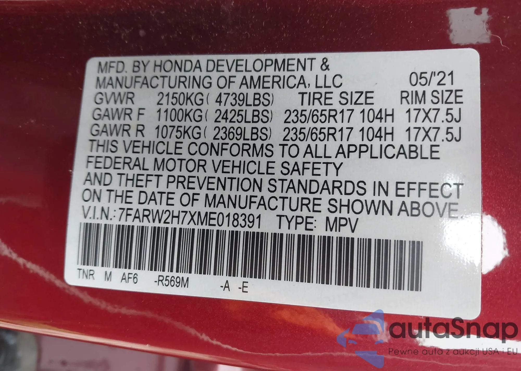 Samochód Honda CR-V 2021 (VIN 7FARW2H7XME018391) nie był wcześniej licytowany. Dokumenty są czyste, przebieg odpowiada lub jest niższy niż średnia rynku. Sprzedaje go firma ubezpieczeniowa – polecamy zakup. Dostawa do portu zajmie ok. 6–8 tygodni.