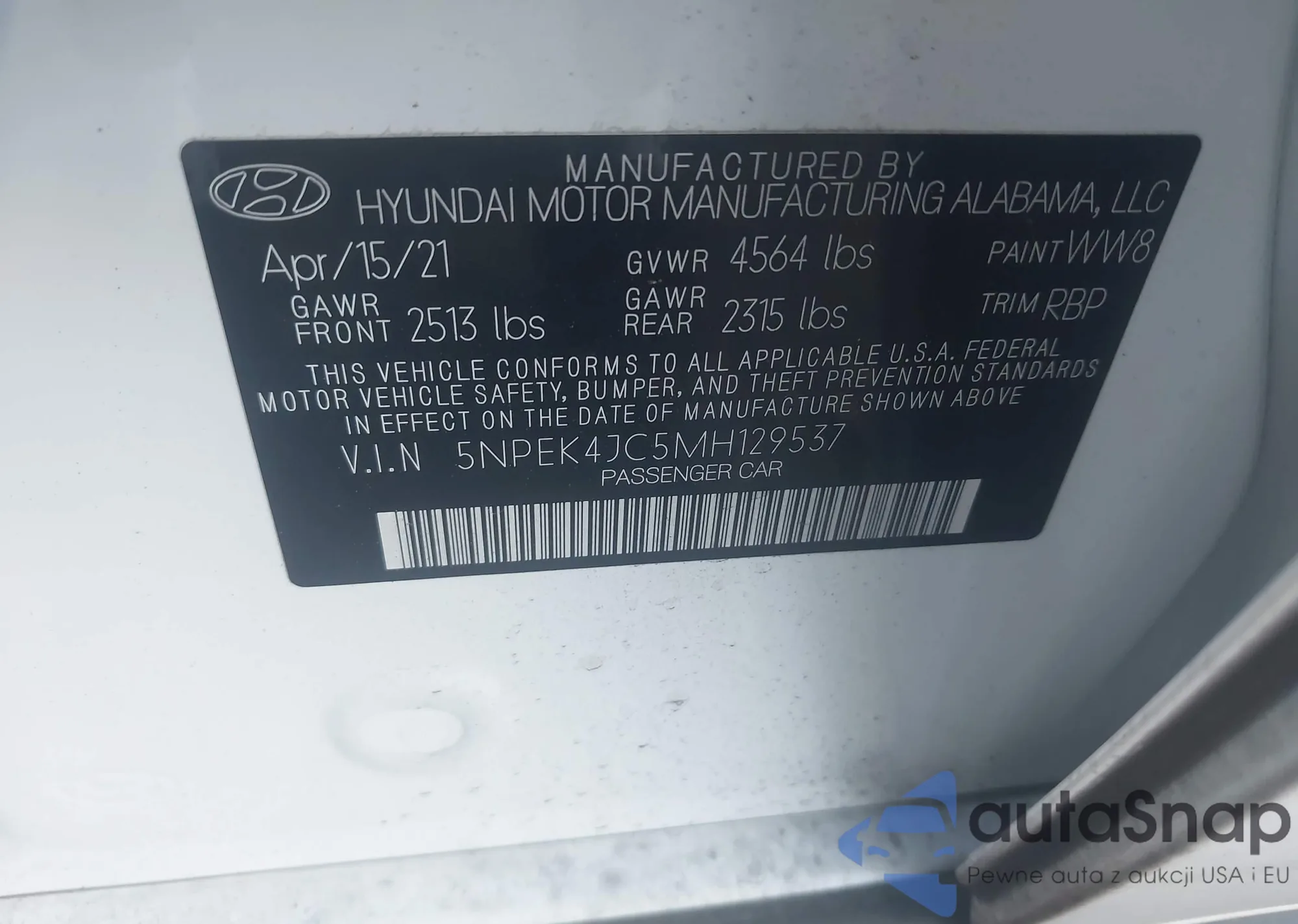 VIN: 5NPEK4JC5MH129537