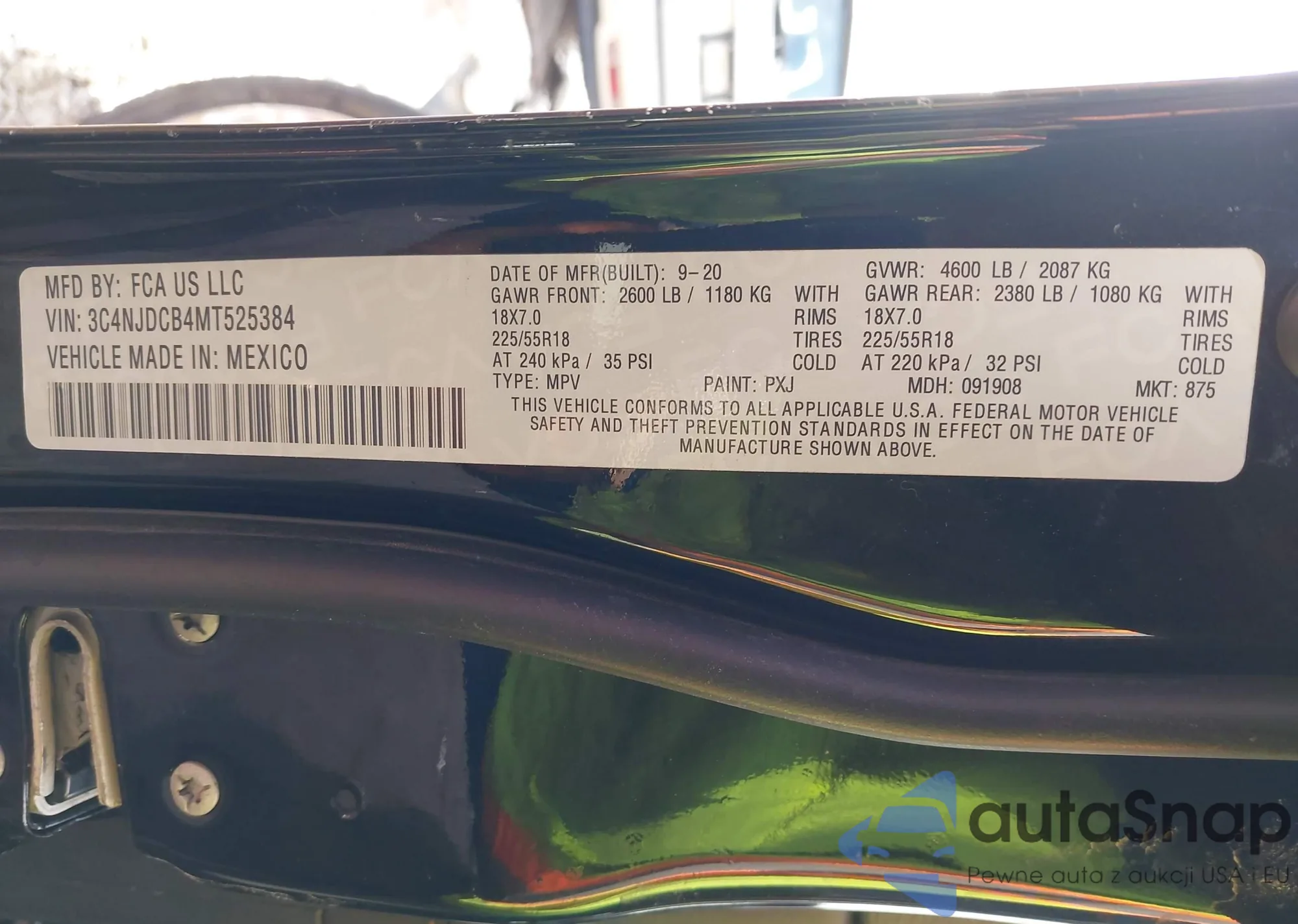 Samochód Jeep Compass 2021 (VIN 3C4NJDCB4MT525384) nie był wcześniej licytowany. Dokumenty są czyste, przebieg odpowiada lub jest niższy niż średnia rynku. Sprzedaje go firma ubezpieczeniowa – polecamy zakup. Dostawa do portu zajmie ok. 6–8 tygodni.
