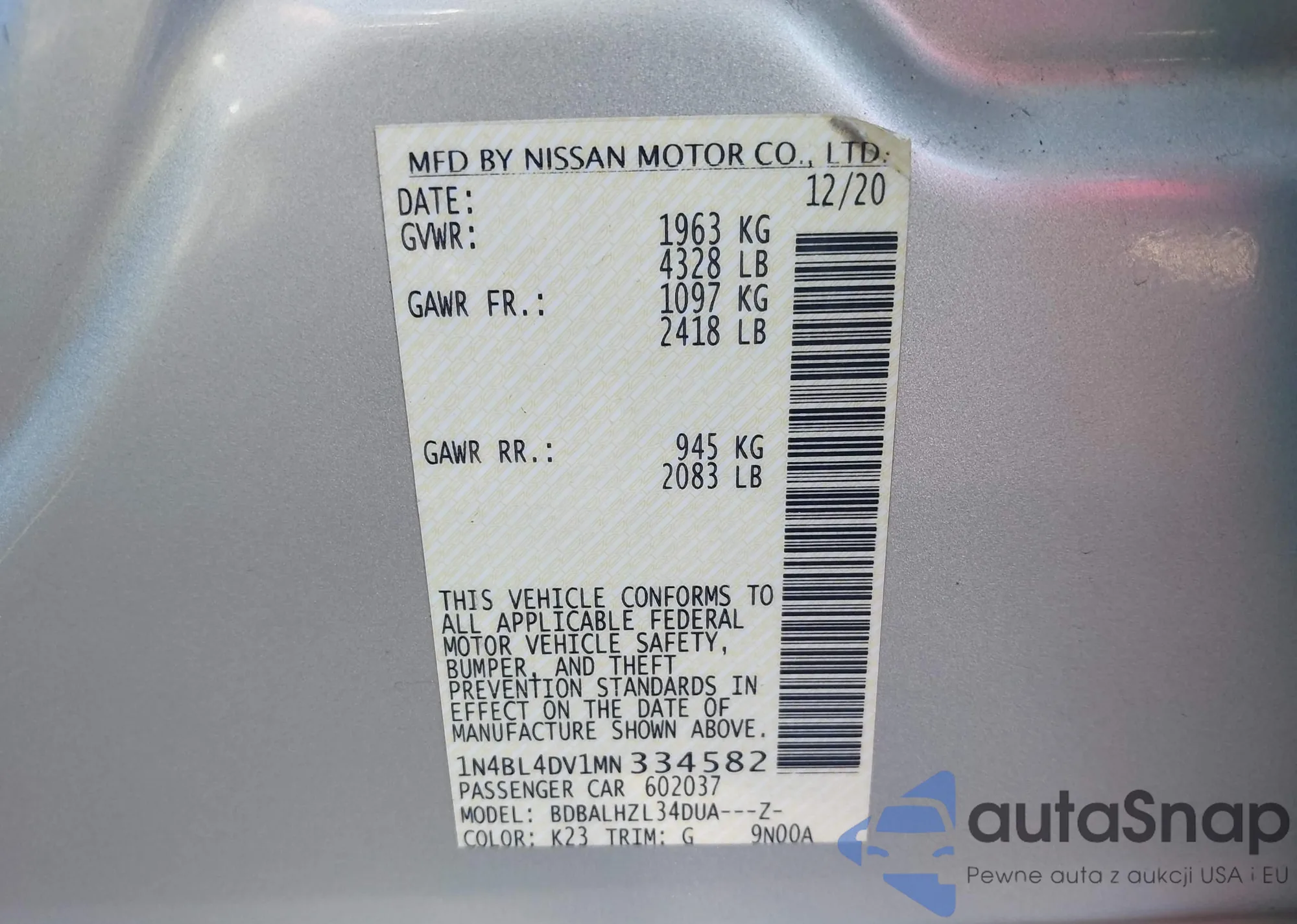 Samochód Nissan Altima 2021 (VIN 1N4BL4DV1MN334582) nie był wcześniej licytowany. Dokumenty są czyste, przebieg odpowiada lub jest niższy niż średnia rynku. Sprzedaje go firma ubezpieczeniowa – polecamy zakup. Dostawa do portu zajmie ok. 6–8 tygodni.