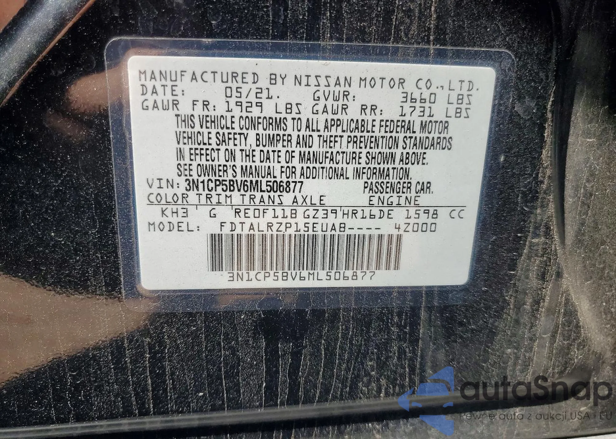 Samochód Nissan Kicks 2021 (VIN 3N1CP5BV6ML506877) nie był wcześniej licytowany. Dokumenty są czyste, przebieg odpowiada lub jest niższy niż średnia rynku. Sprzedaje go firma ubezpieczeniowa – polecamy zakup. Dostawa do portu zajmie ok. 6–8 tygodni.