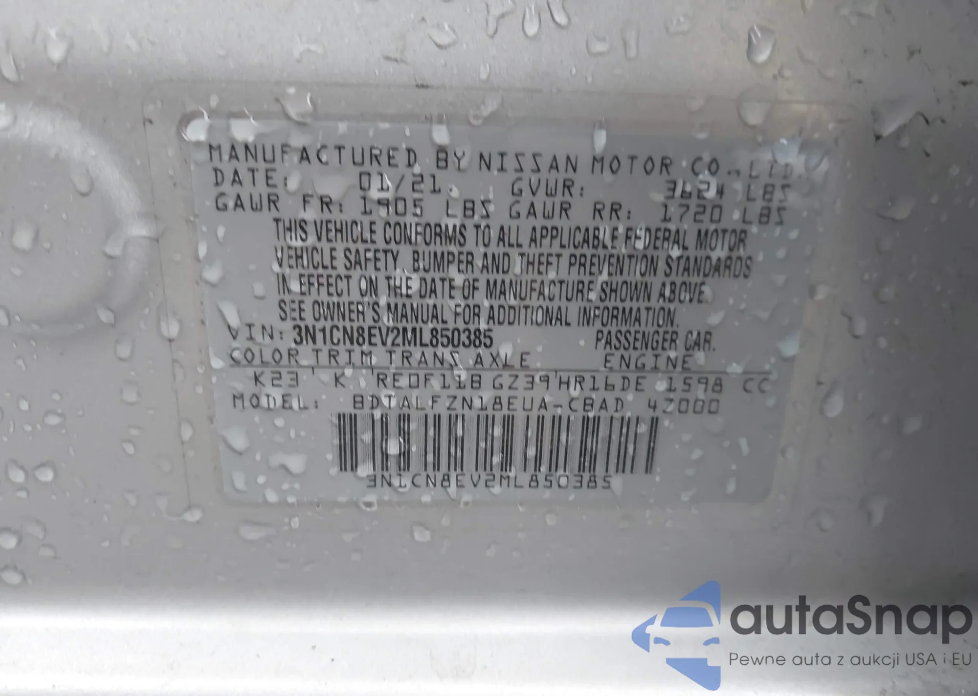 Samochód Nissan Versa 2021 (VIN 3N1CN8EV2ML850385) nie był wcześniej licytowany. Dokumenty są czyste, przebieg odpowiada lub jest niższy niż średnia rynku. Sprzedaje go firma ubezpieczeniowa – polecamy zakup. Dostawa do portu zajmie ok. 6–8 tygodni.