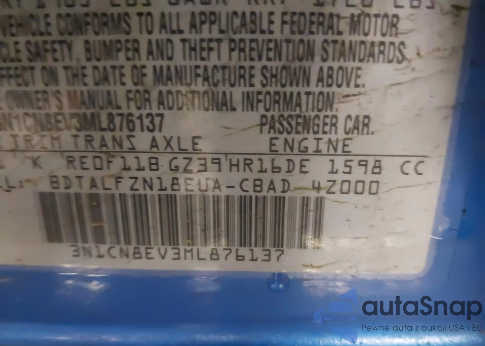 Samochód Nissan Versa 2021 (VIN 3N1CN8EV3ML876137) nie był wcześniej licytowany. Dokumenty są czyste, przebieg odpowiada lub jest niższy niż średnia rynku. Sprzedaje go firma ubezpieczeniowa – polecamy zakup. Dostawa do portu zajmie ok. 6–8 tygodni.